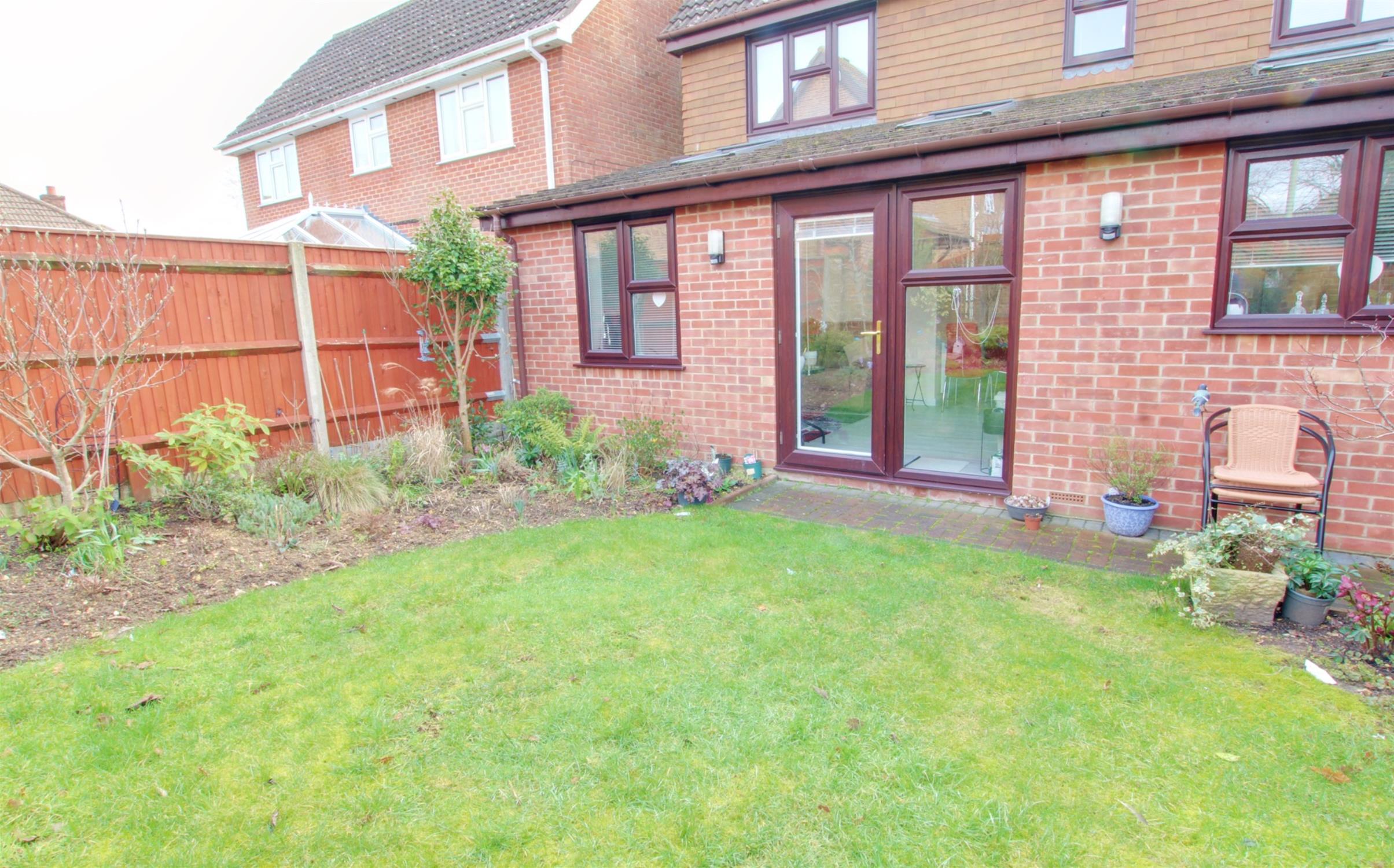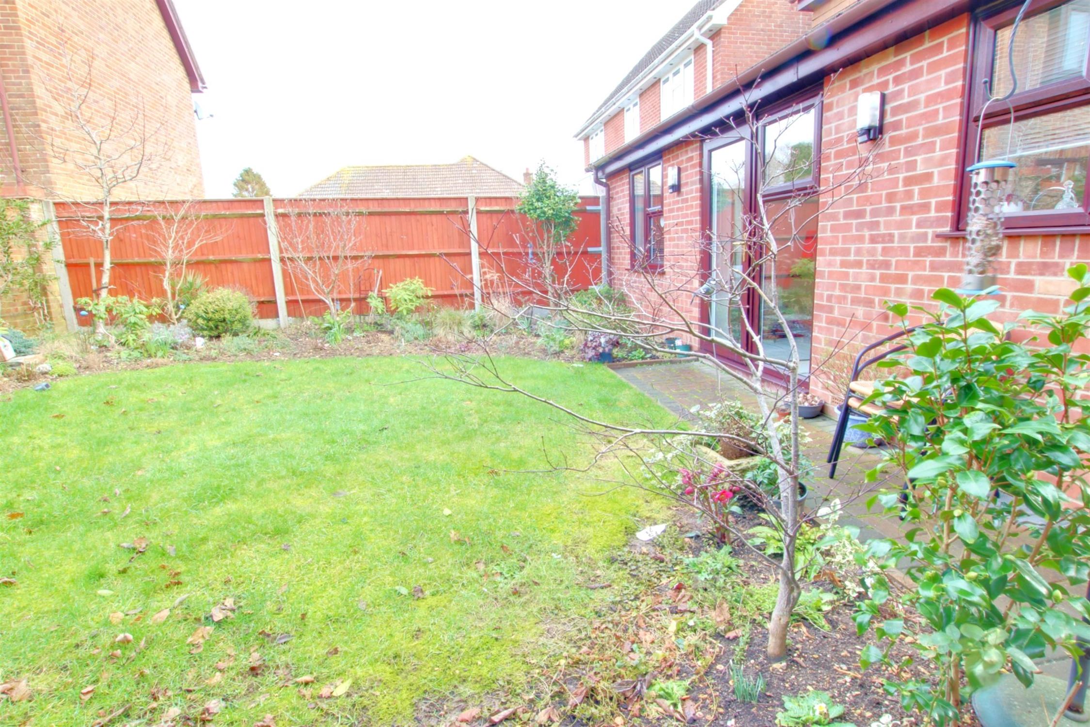 Fencing and brick walling to boundaries. Laid to lawn with established shrubs and bushes. Brick pavia pathway to side garage door.