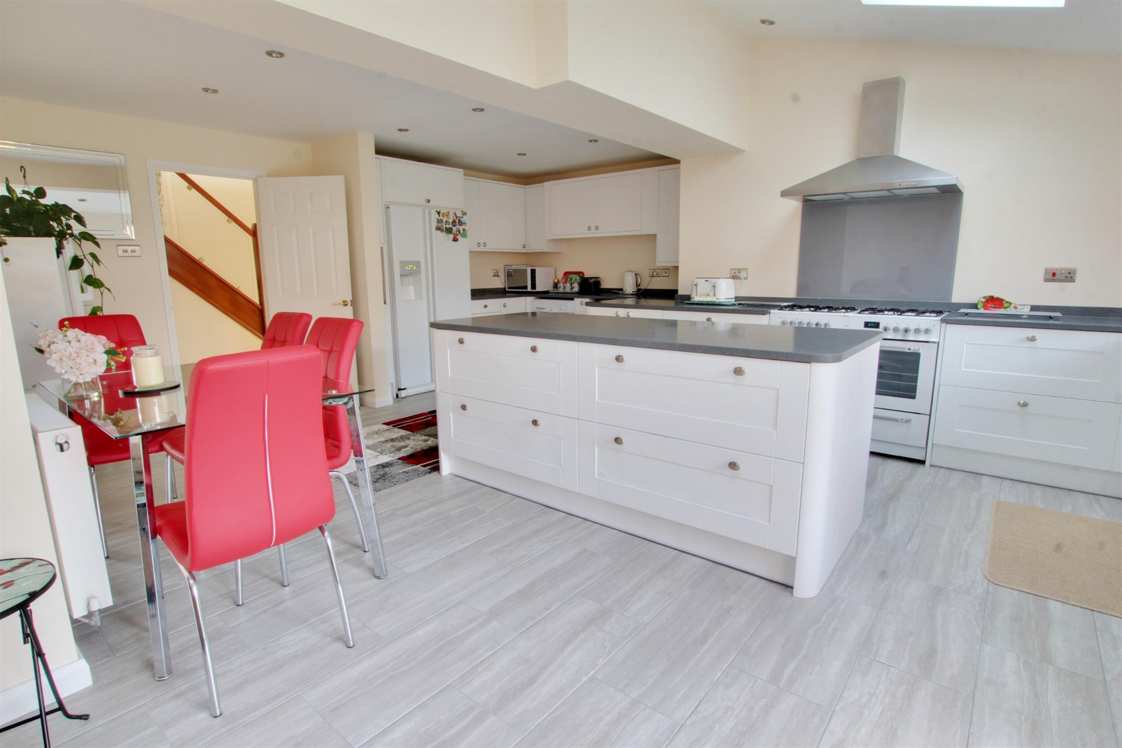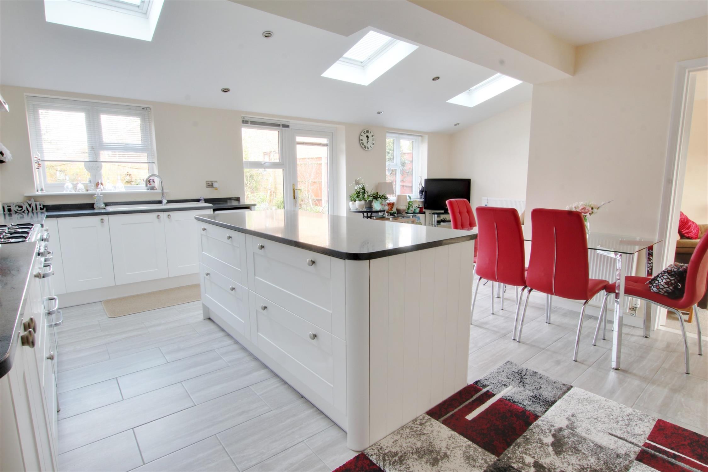 Two windows to rear. Three velux windows. Door overlooking and leading to rear garden. White shaker style fitted base units with working surfaces over. Inset sink with mixer tap and complementary tiling to splashback. Range style double oven with eight ring gas hob and extractor fitted over. Fitted american fridge/freezer. Space and plumbing for washing machine, tumble dryer and dishwasher.