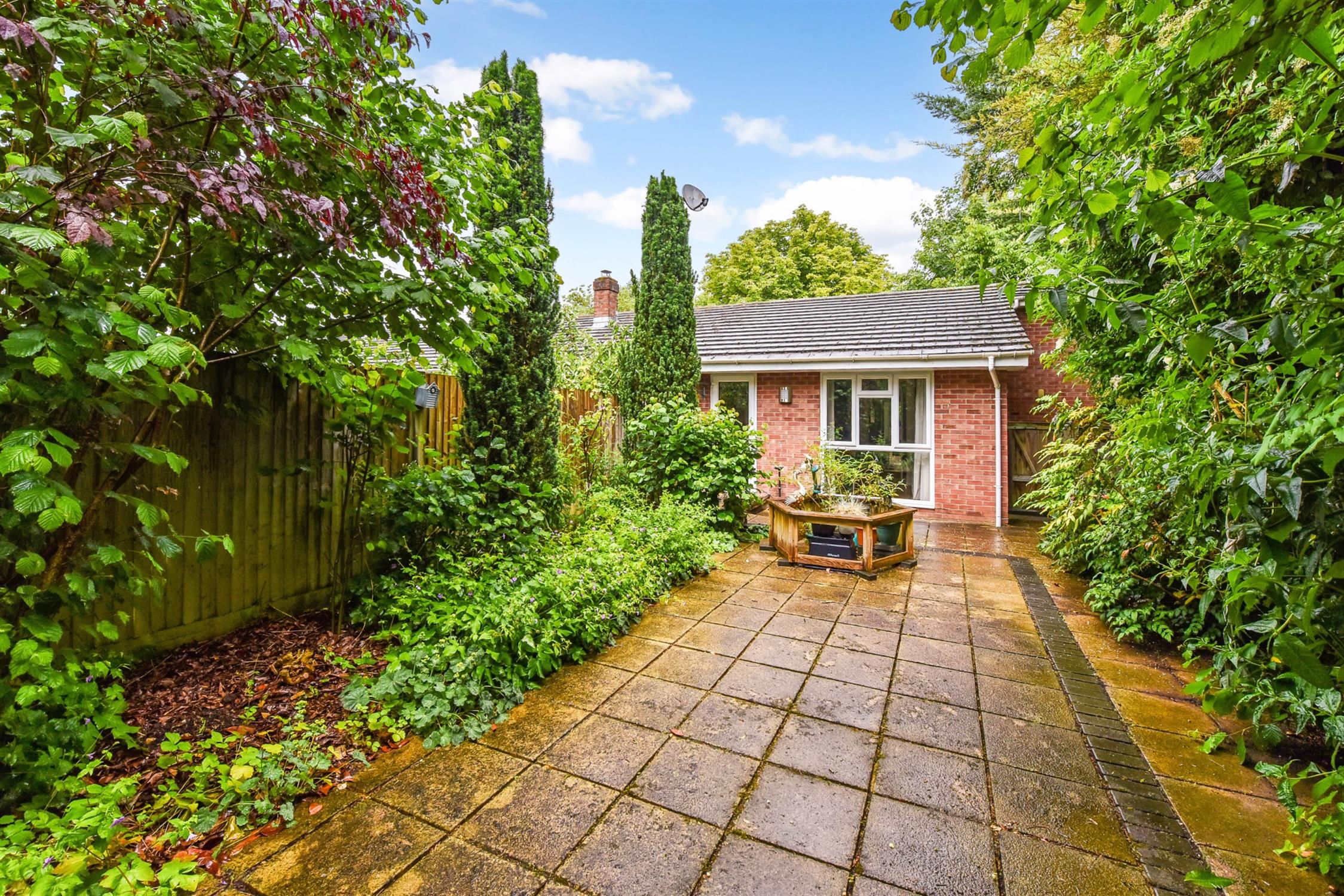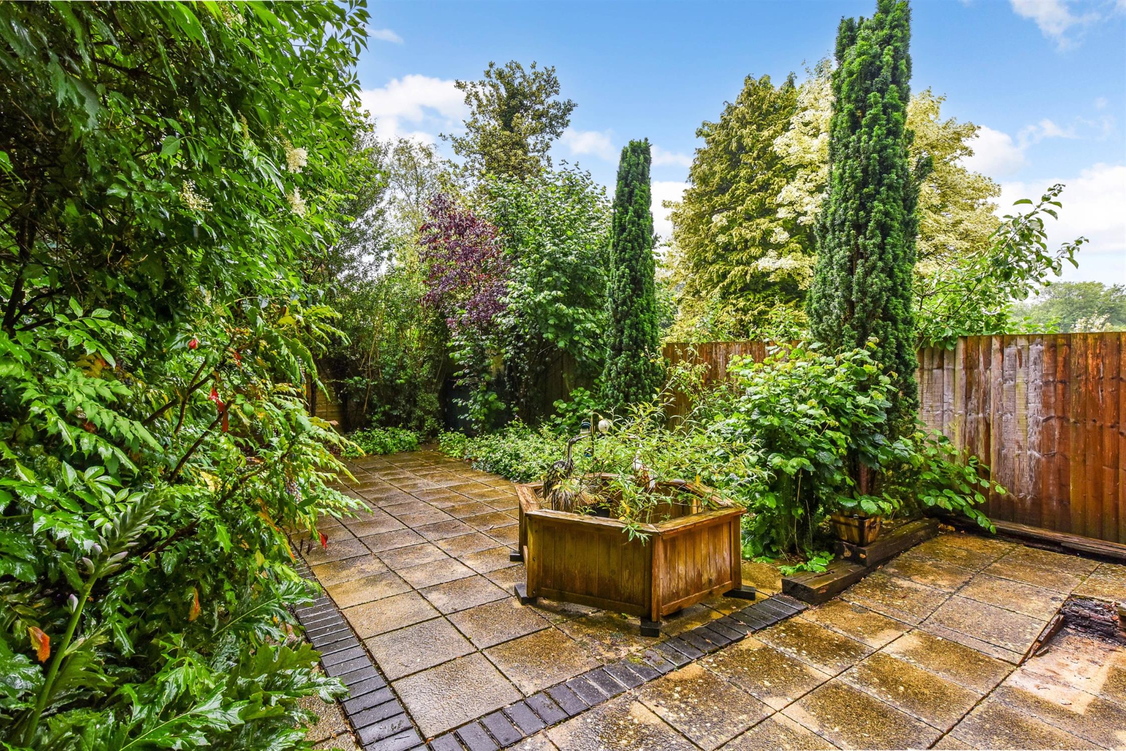 Southwest-facing garden, patio area with beds to either side and side access.