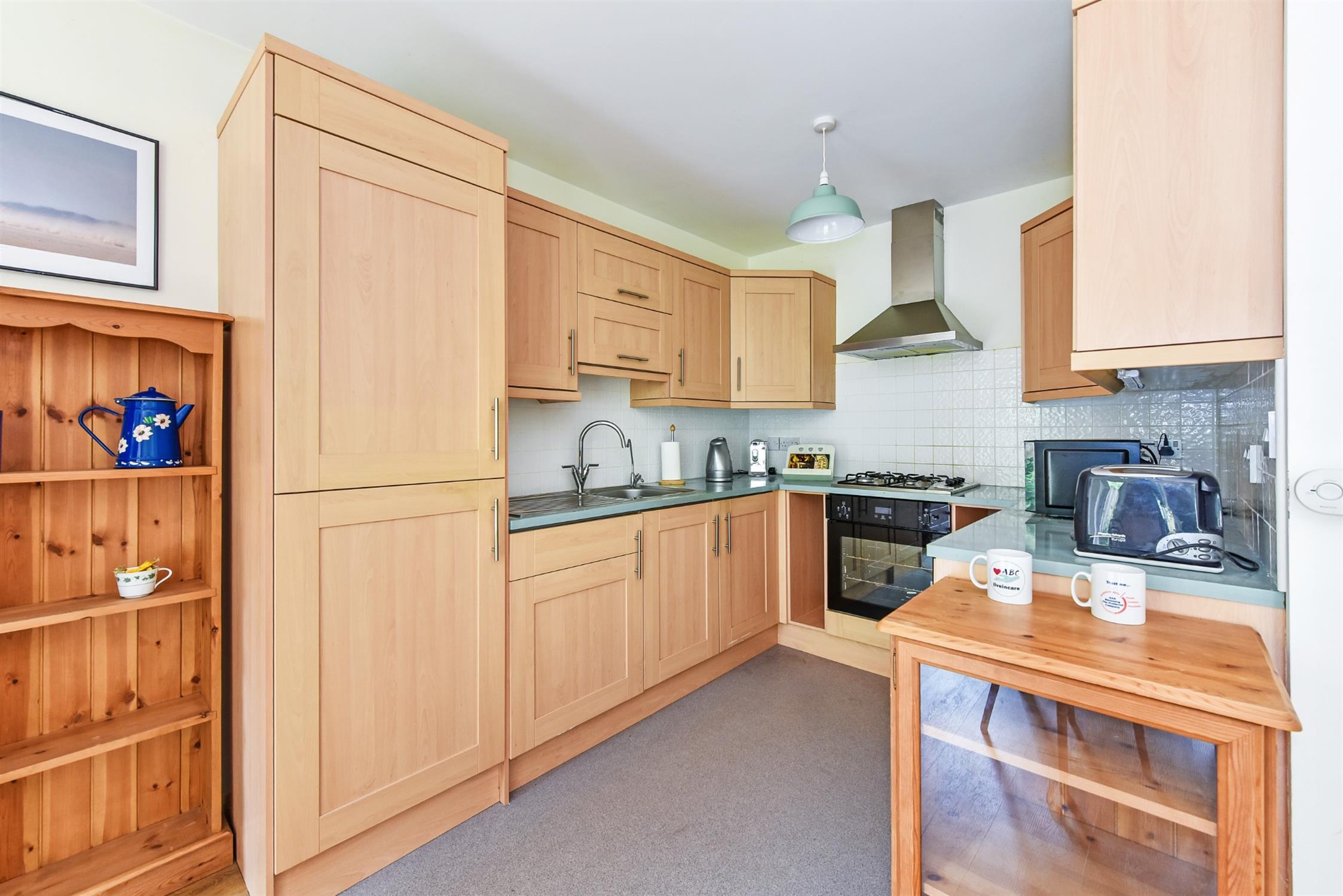 The kitchen appliances include gas hob, oven, sink with drainer, built-in washing machine, large built-in fridge freezer and there are ample high and low-level units.