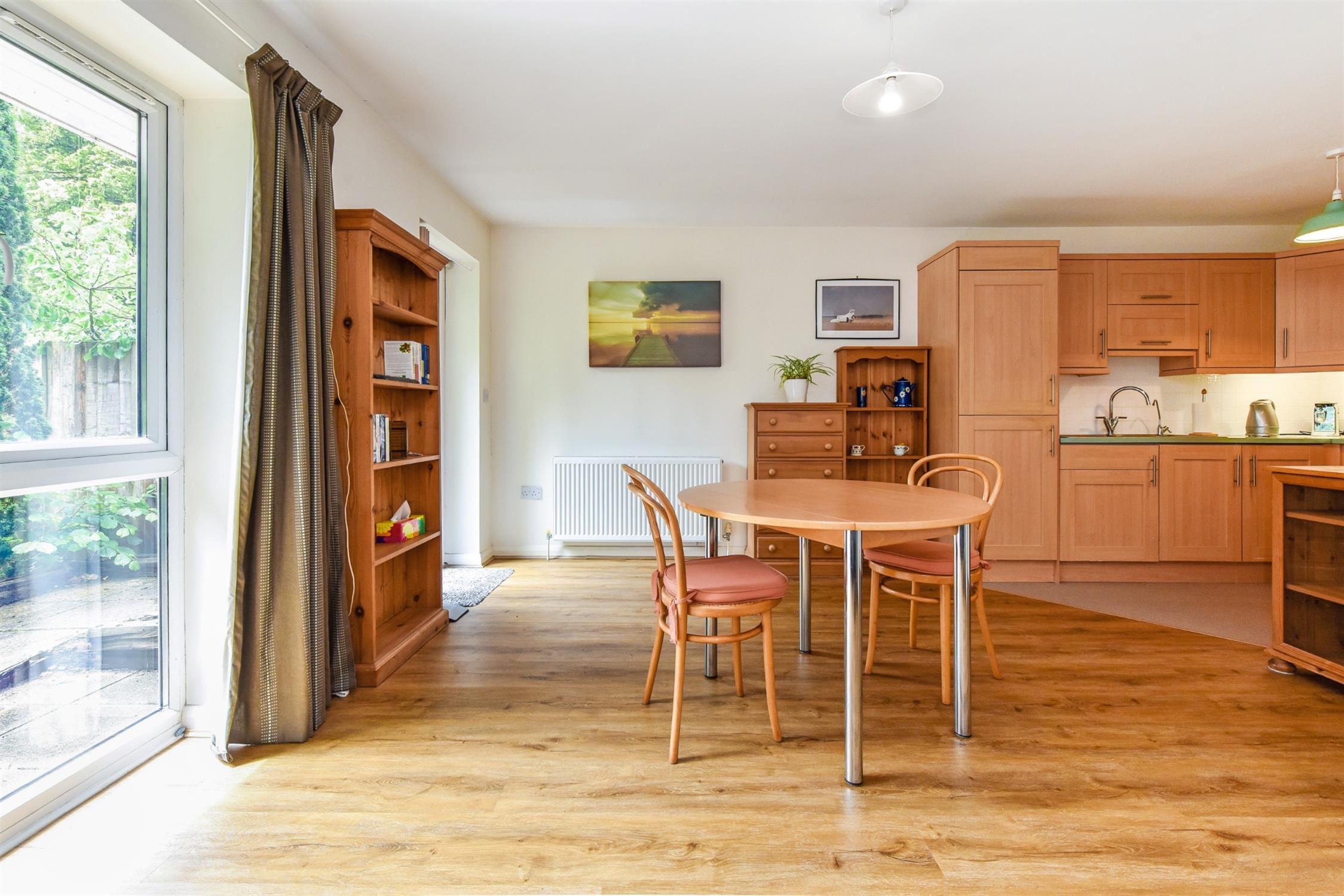 A bright and neat living area with lots of light from the floor to ceiling window and door for access to the garden.