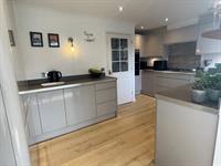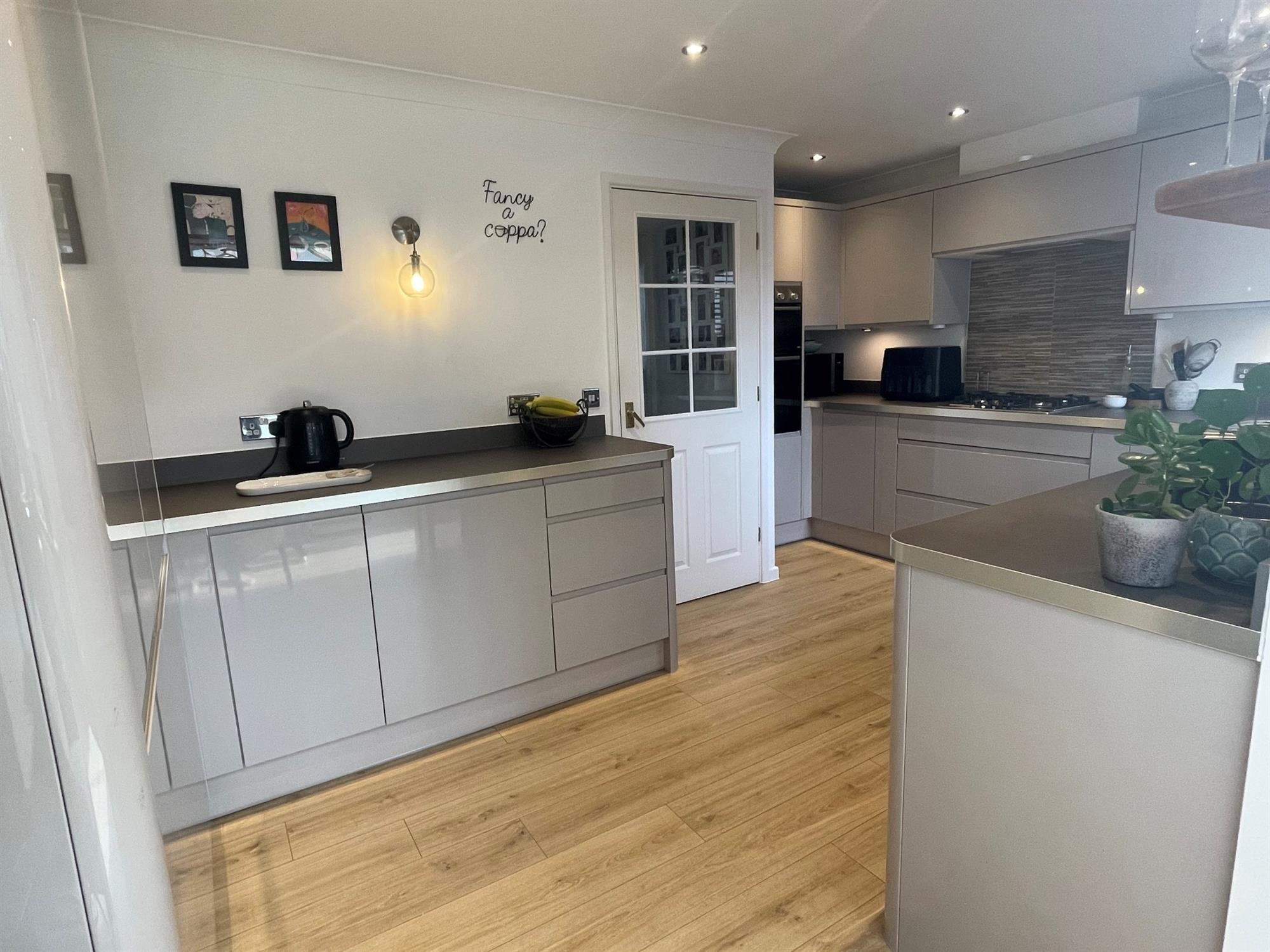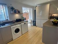 Window to rear. Range of wall and base units with work surfaces over. One and a half bowl sink unit with mixer tap. 4 ring gas hob with extractor over. Built in eye level double electric oven. Integrated fridge freezer, separate freezer, Dishwasher and washing machine. Radiator. Opening into:
