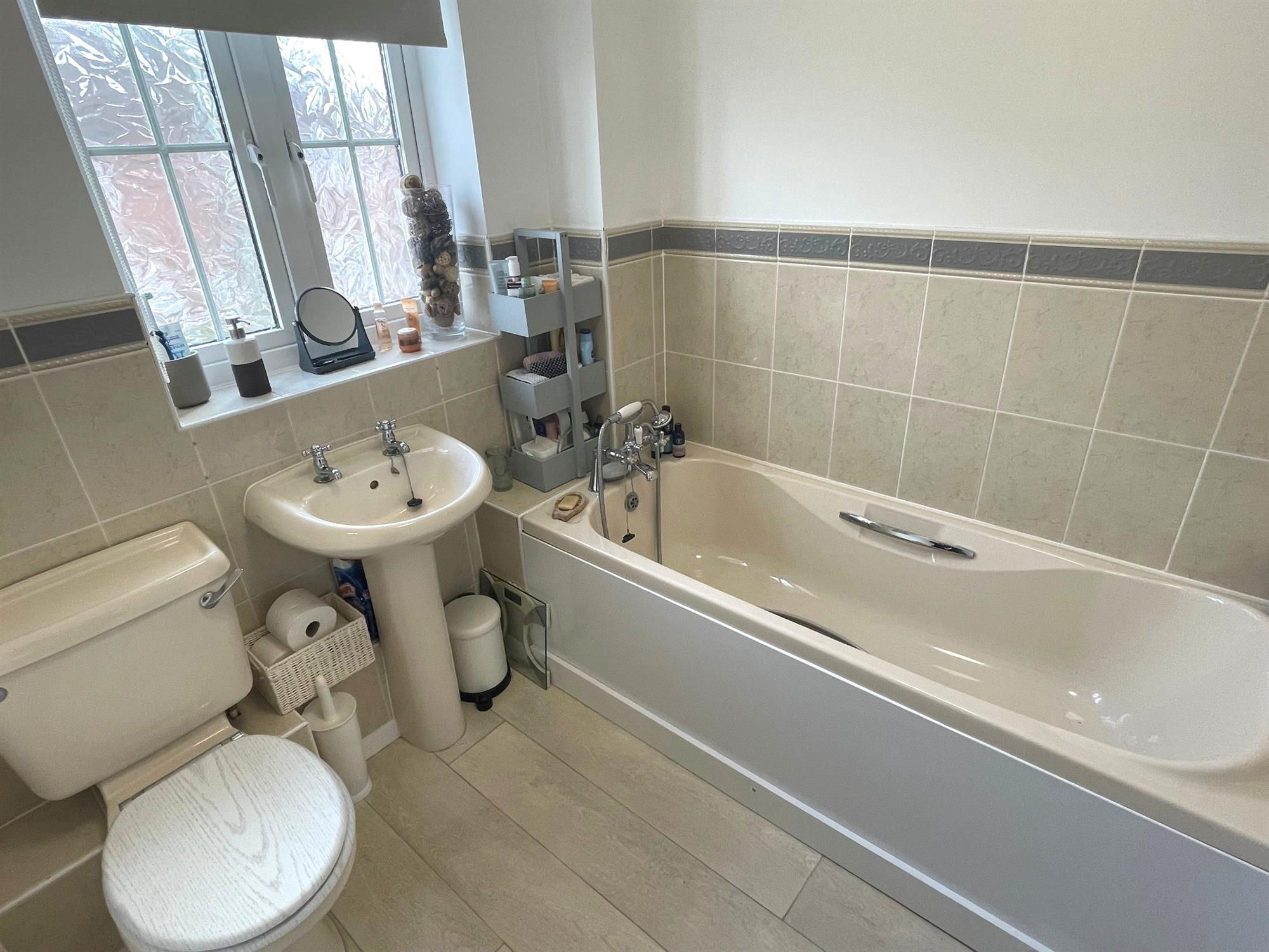 Window to front. Low level WC. Pedestal wash hand basin. Panelled bath with mixer tap. Complementary tiling. Radiator.