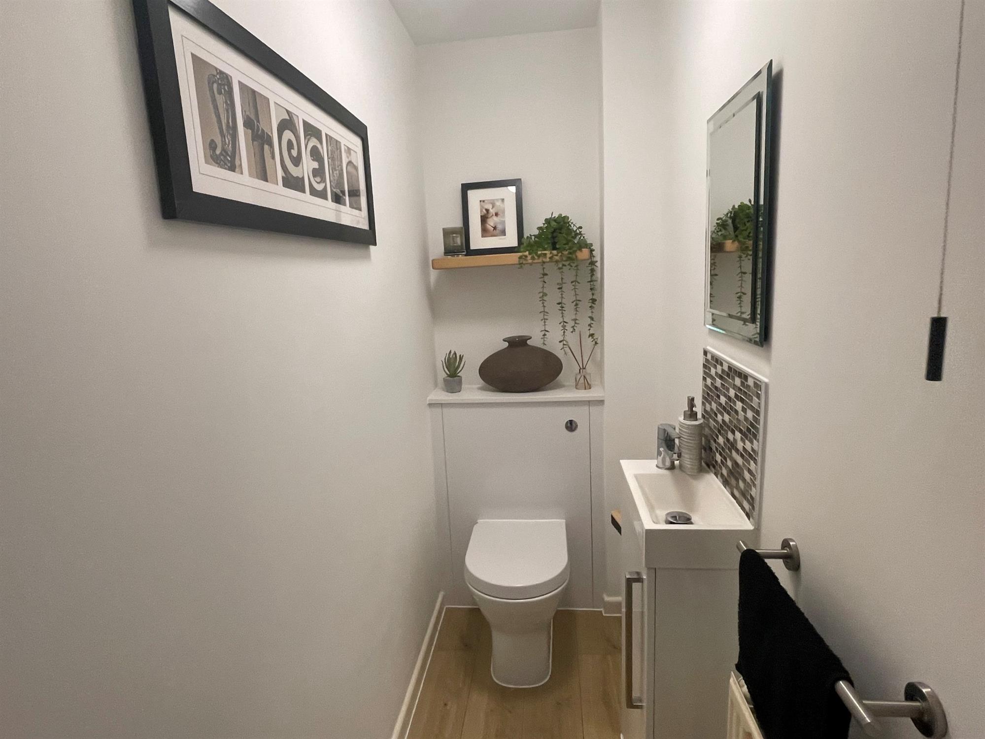 Low level WC with concealed flush. Inset wash hand basin with cupboard below. Tiled splashback. Radiator.