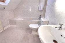 Panelled bath with shower screen, mixer tap and shower attachment above. Low level W.C. pedestal sink. Carpeted flooring. Tiled walls. Velux window.