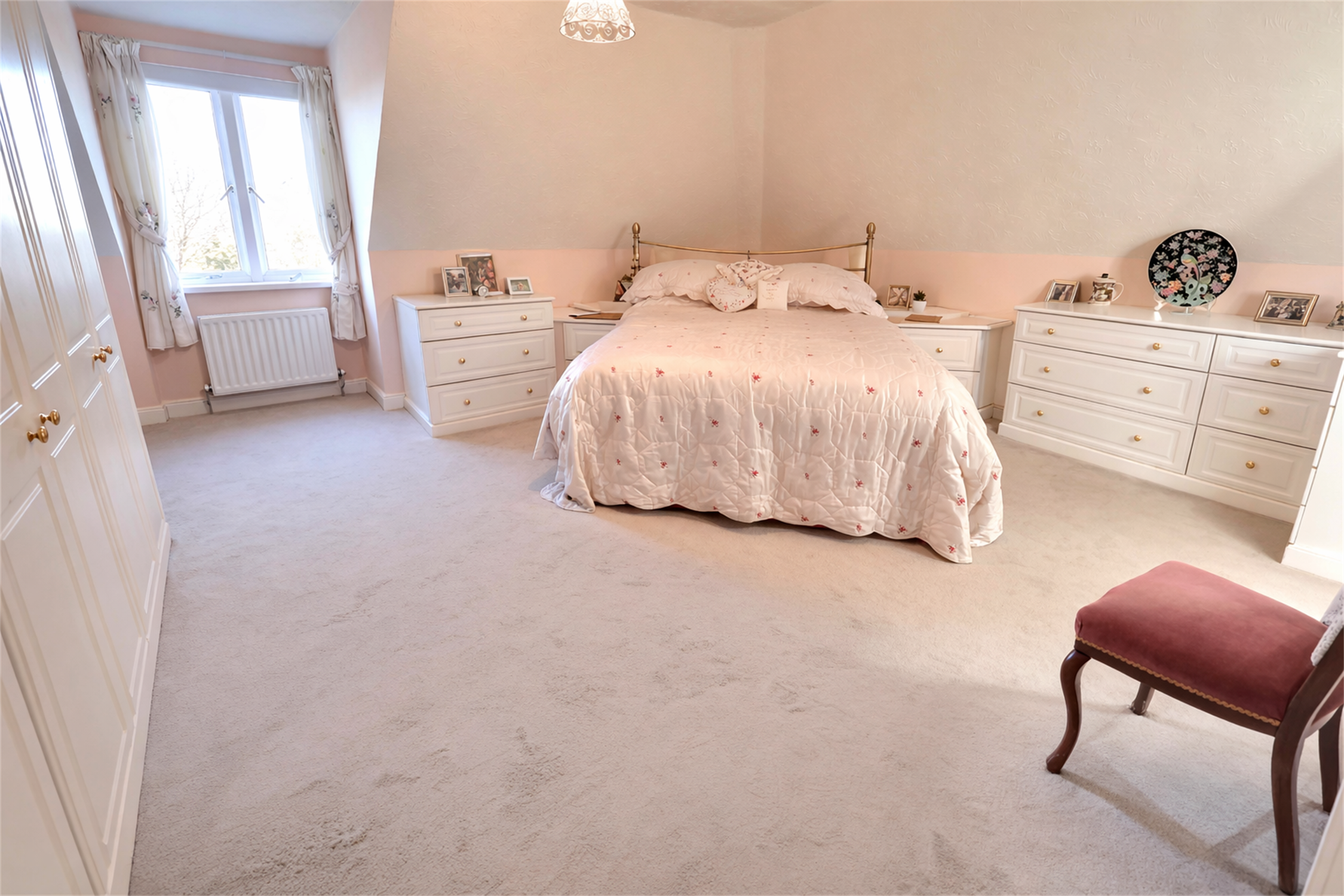 Carpeted flooring, textured ceiling and smooth walls. Built in wardrobes, cupboards, chest of drawers and dressing table. Radiator. Door to:-