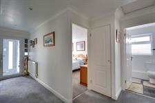 Smooth plastered and coved ceiling with inset lighting. Access to loft via hatchway. Shelved storage cupboard with smoke alarm. Doors to;