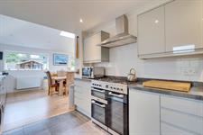 Smooth plastered ceiling with inset lighting. Glazed uPVC side door accessing the rear. Tiled flooring. Wall mounted gas boiler. Kitchen comprises a selection of modern floor, wall and drawer units. Sink and drainer with central mixer tap set within a complementary work surface with matching risers. Integrated appliances include fridge/freezer and dishwasher. There is space for a range gas cooker with tiled splash back and extractor fan over. Space for washing machine and tumble dryer. Opening into dining/family area;
