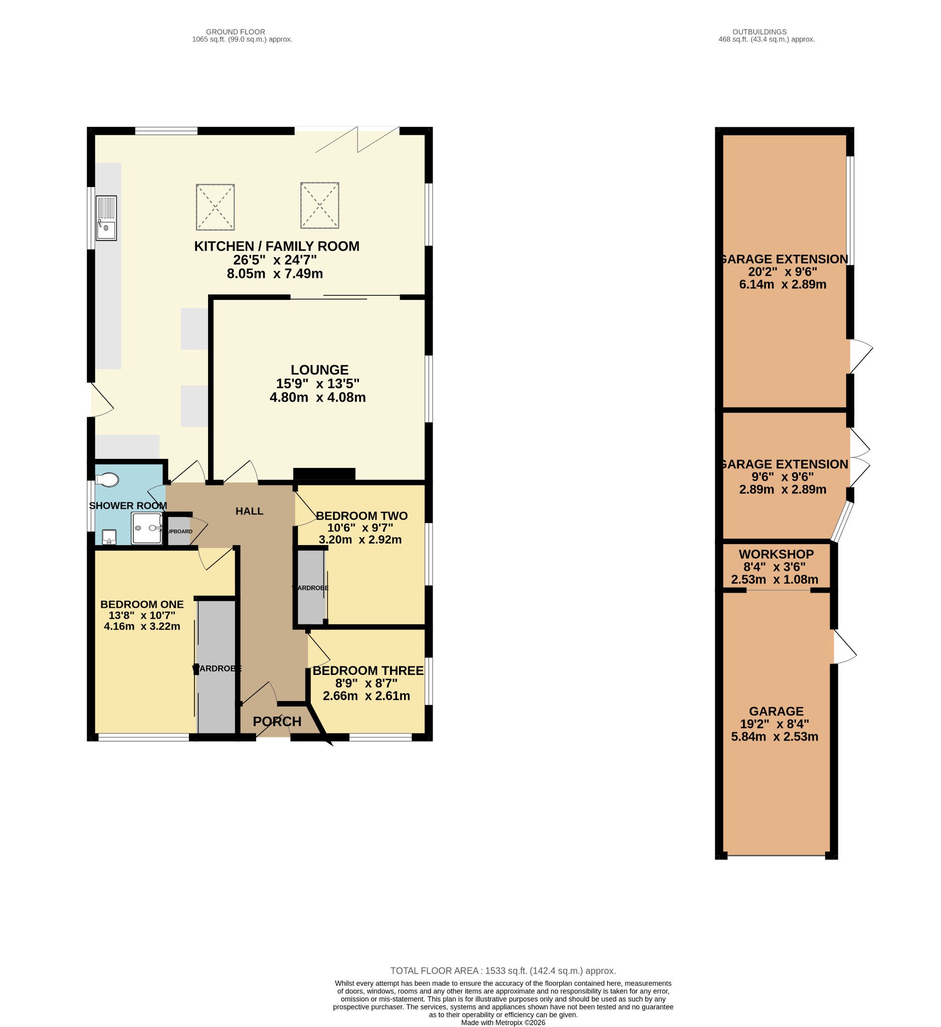 Electric roller door, boarded ceiling, lighting with additional emergency strip light and various electric points. Workshop area with fitted workbench and power points. Extended room to the rear of the garage separated by a partitioned wall, boarded ceiling and inset lighting. UPVC French style doors opening onto the patio. Power points and tiled flooring. Further partitioned room to the rear with uPVC window and frosted glazed door. Boarded ceiling with strip lighting and additional emergency lighting. Screeded floor, boarded walls and power points.