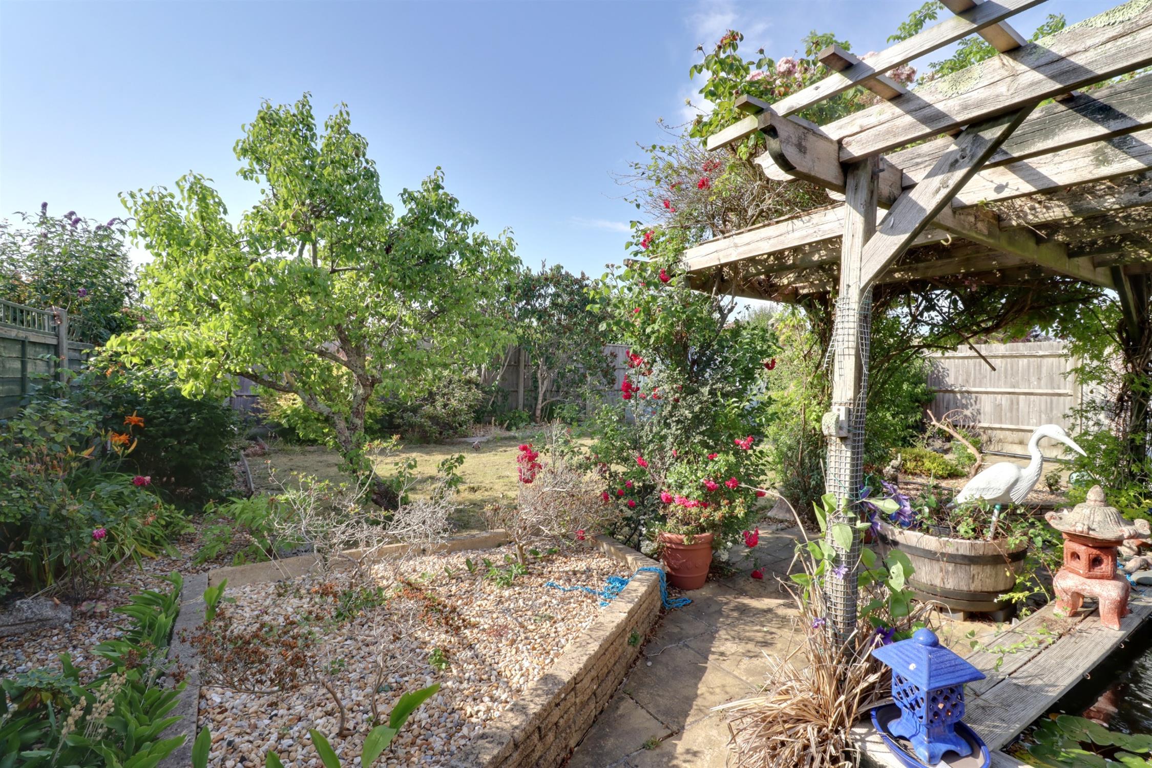 A well stocked and private garden, enclosed by fence, interlinking patio areas, lawn with a variety of mature shrubs hedges and flowers, Koi Carp fishpond with filter, pergola, undercover seating area, greenhouse.