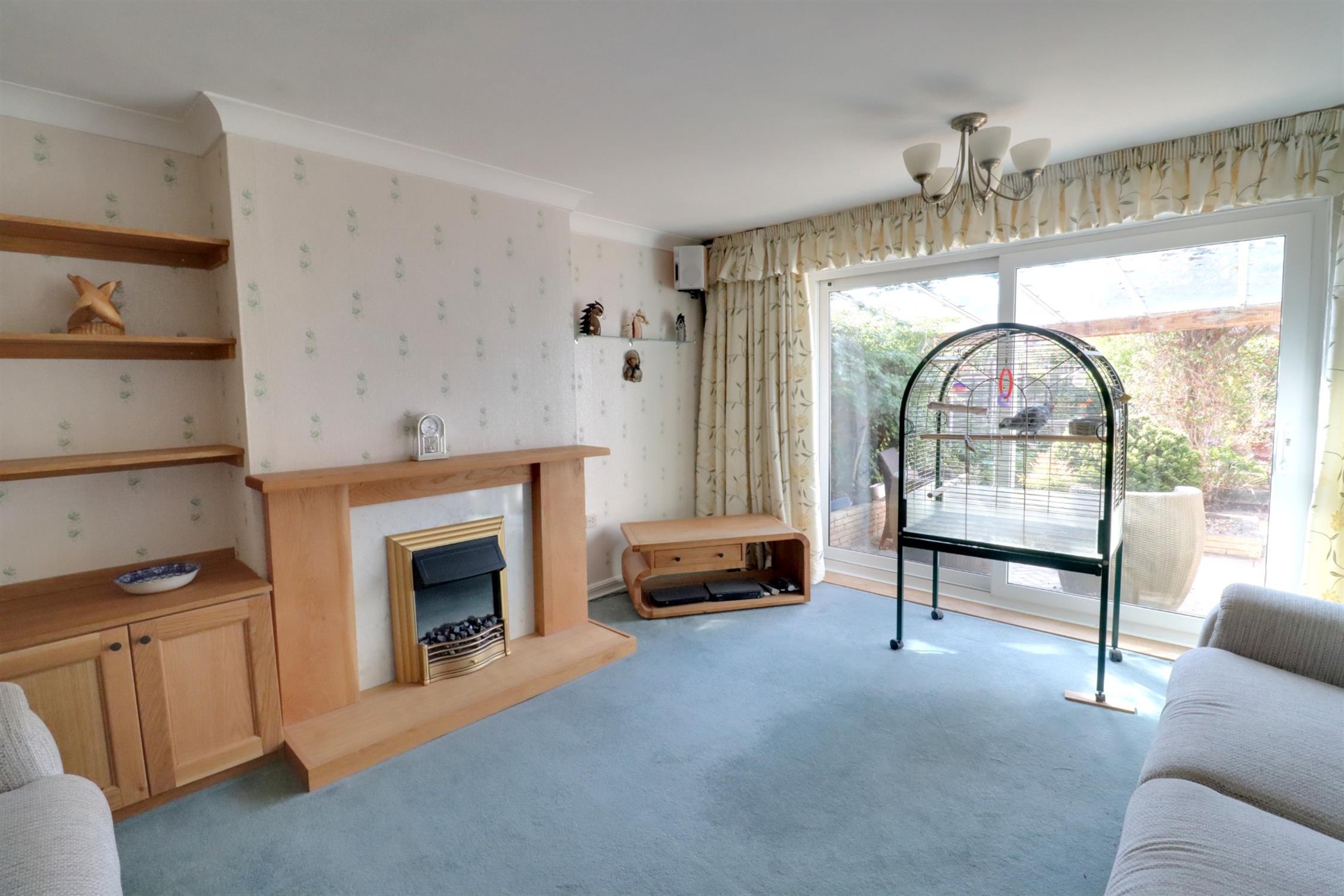 Fireplace with electric fire, built in storage and shelving, radiator, rear aspect double glazed patio doors leading to the rear garden.