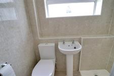Shower enclosure with glass screen and folding seat, low level WC, wash basin in pedestal, radiator, side aspect double glazed window.
