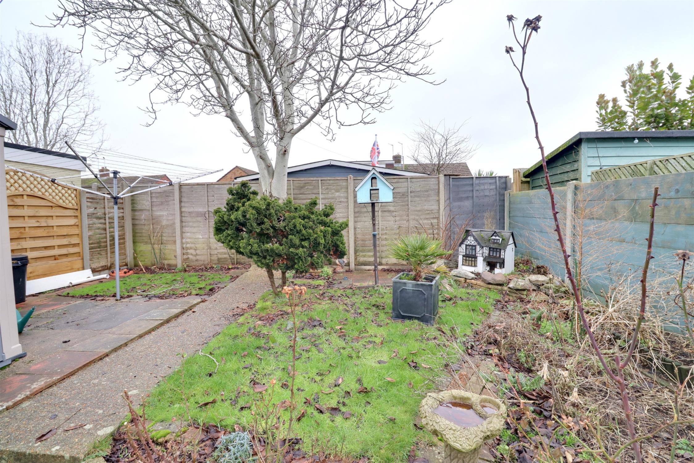 Enclosed by fence, lawn and patio areas, raised shrub borders, side pedestrian access, outside tap, plastic shed.
