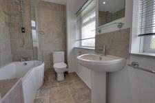 BATHROOM: White suite comprising, bath with shower over, WC and pedestal wash hand basin, tiled walls and floor, dual rear aspect double glazed windows, chrome heated towel rail