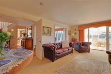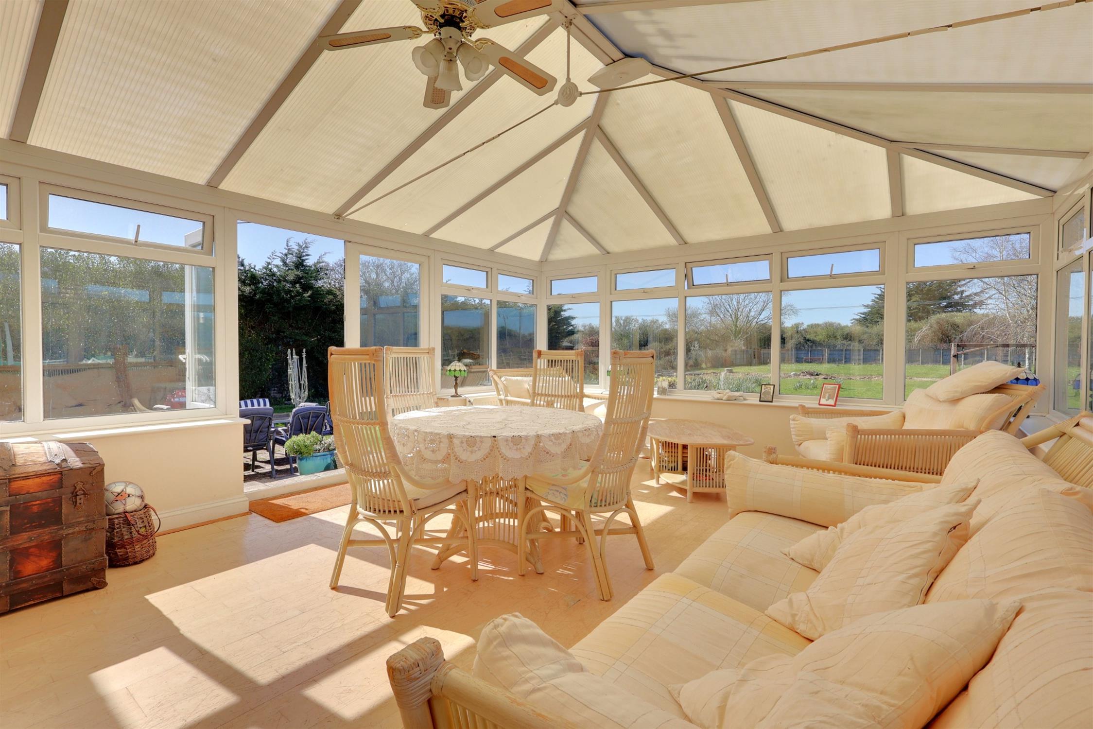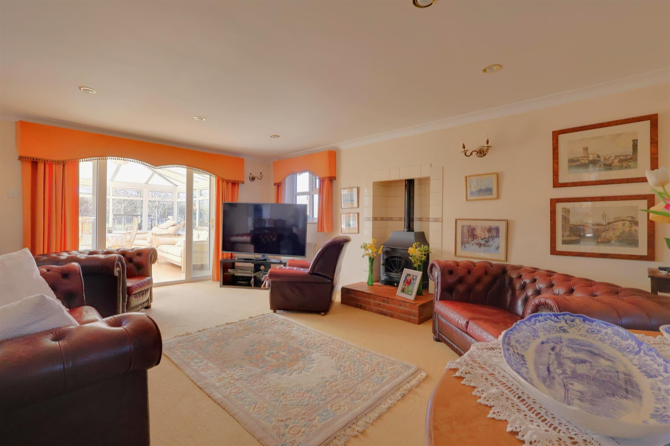Gas fireplace. Two radiators. Two pairs of double doors. French doors to conservatory.