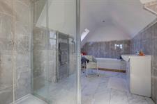 Walk-in shower cubicle. Panelled bath. WC. Ceramic sink with cupboard under. Heated towel rail. Tiled flooring. Velux window. Frosted double glazed window.