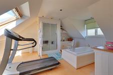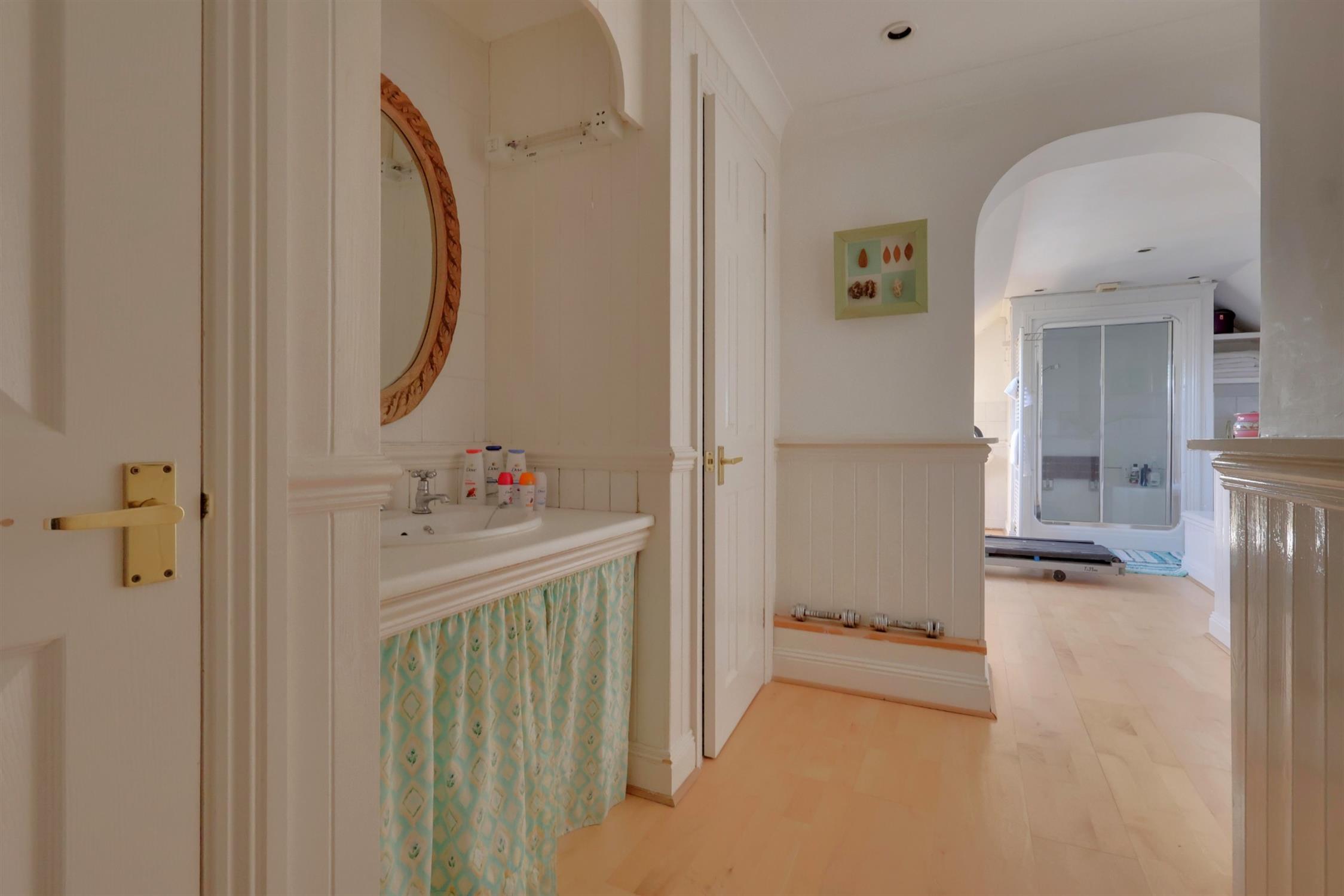 Shower cubicle. Panelled bath. WC. Ceramic sink. Heated towel rail. Radiator. Two store cupboards. Velux window. Frosted double glazed window.