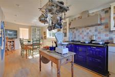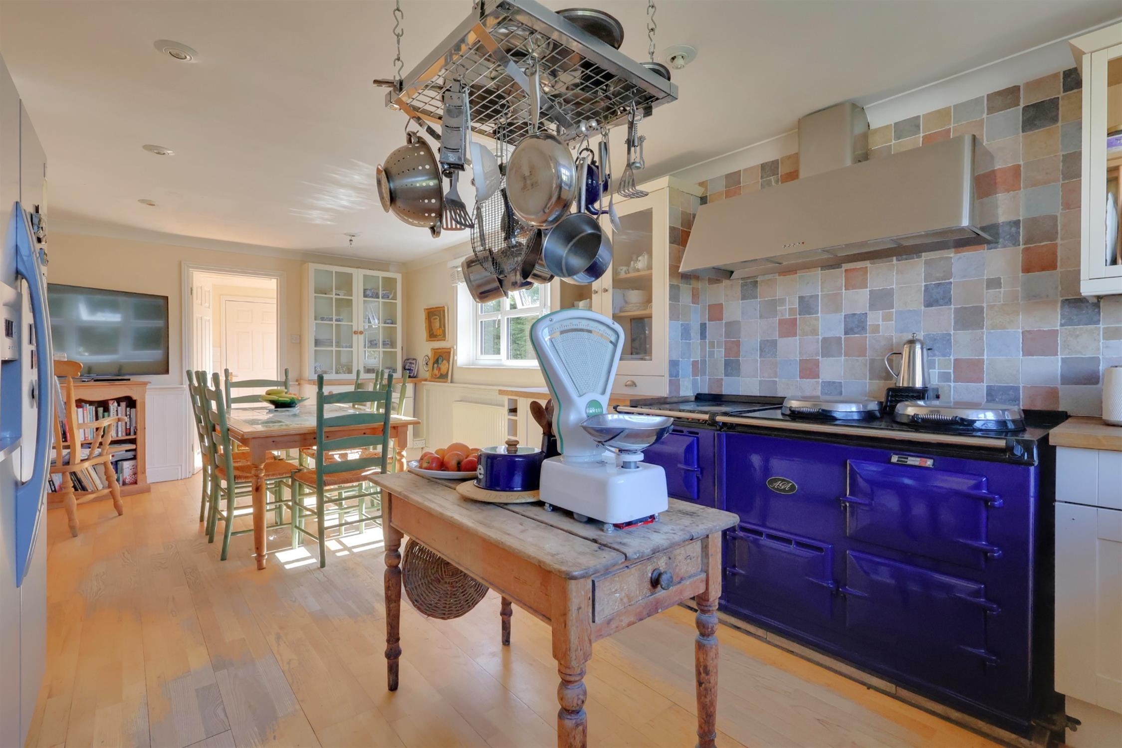 A range of wall and base cupboards with wooden work surface over. Range style oven. Integrated dishwasher. Inset one and a half ceramic sink with drainer. Radiator. Two double glazed windows.