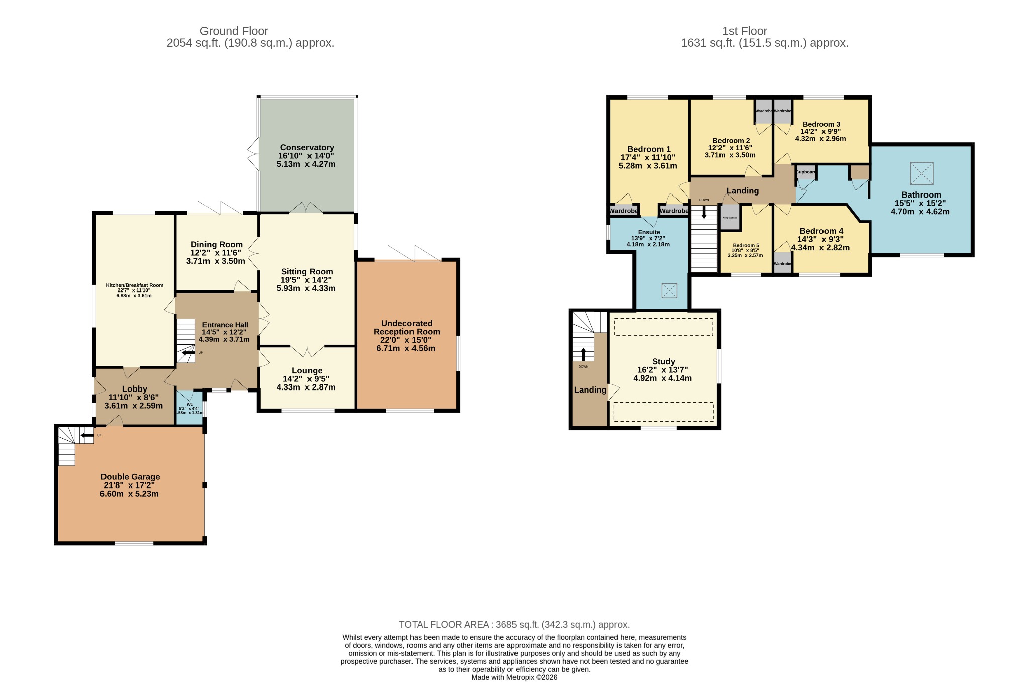 There is a further driveway which provides access to the rear of the property if necessary. A spacious and welcoming entrance hall provides a ground floor cloakroom/WC and access to all of the principal rooms. The three primary reception rooms feature double doors which makes the accommodation flow effortlessly, drawing in plenty of natural light. The dining room has bi-fold doors which open onto the rear garden and the lounge has French doors opening into the generous conservatory. There is currently an additional, undecorated reception room which can be accessed via the rear garden. It is a spacious and versatile space that features a double glazed window and bi-fold doors.The kitchen/breakfast room has a range style oven, dual aspect windows and access into a large lobby, which provides external side access and into the double garage. There is a stairwell within the double garage, which leads to a first floor, functioning office/study. From the principal first floor landing is access to the master bedroom with en-suite bathroom, four further bedrooms and a generous family bathroom. With approximately 3,685 sq ft of accommodation, an internal viewing is highly recommended to appreciate the accommodation on offer.