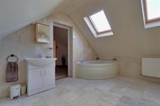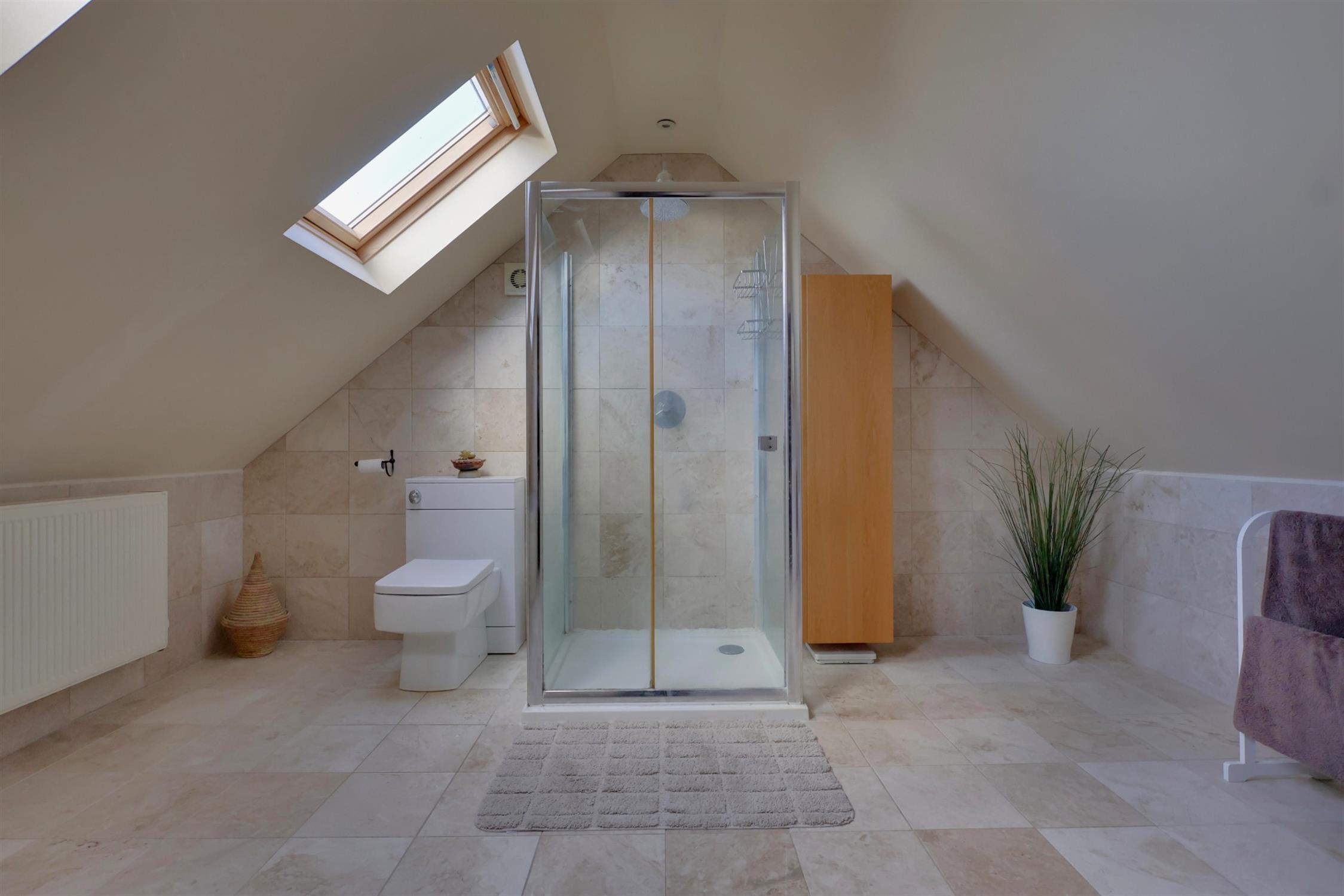 Panelled bath. Shower cubicle. Ceramic sink with cupboard under. WC. Tiled flooring and walls. Extractor fan. Two Velux windows.