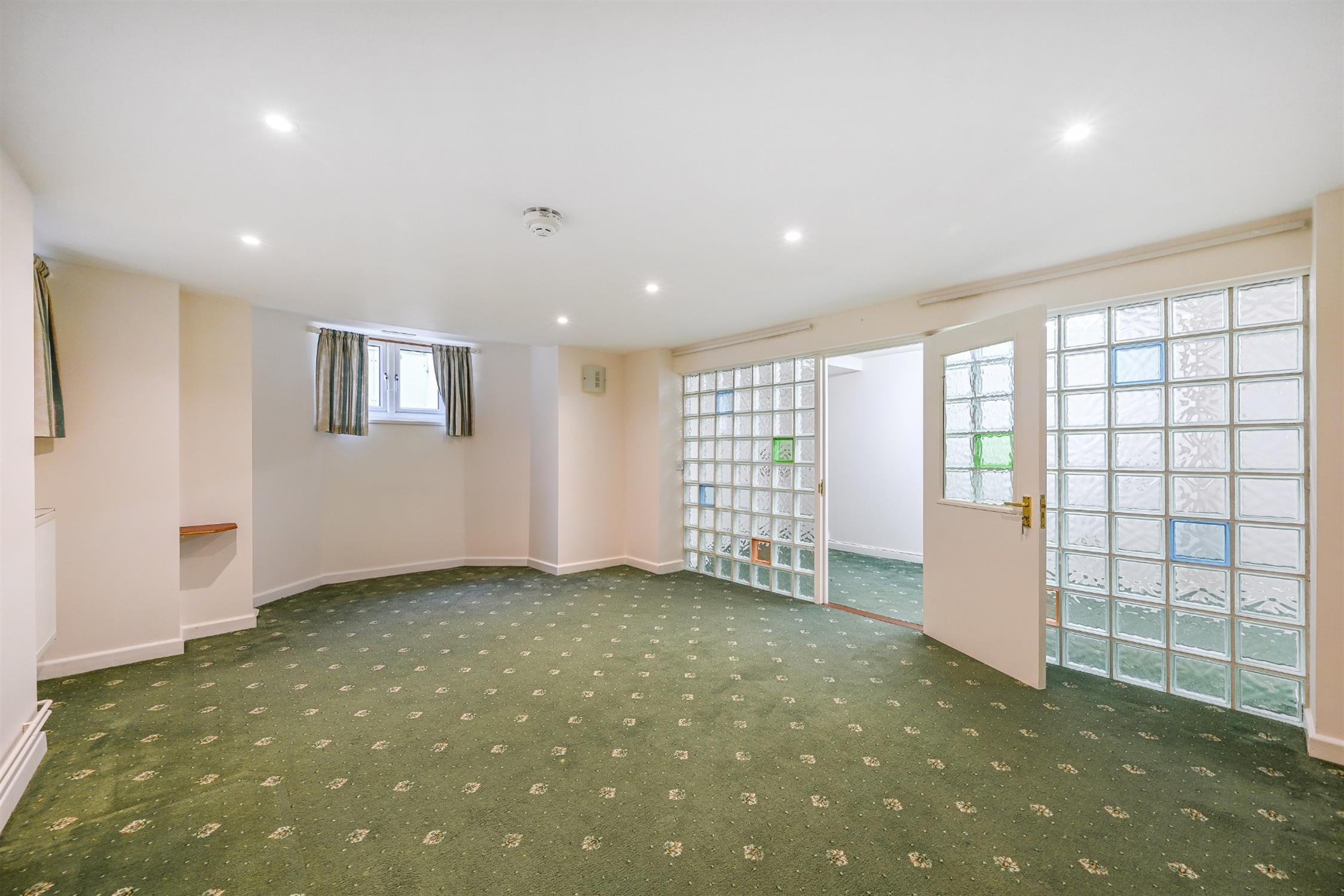 Smooth ceiling, fitted carpet, glass blocks and door to: