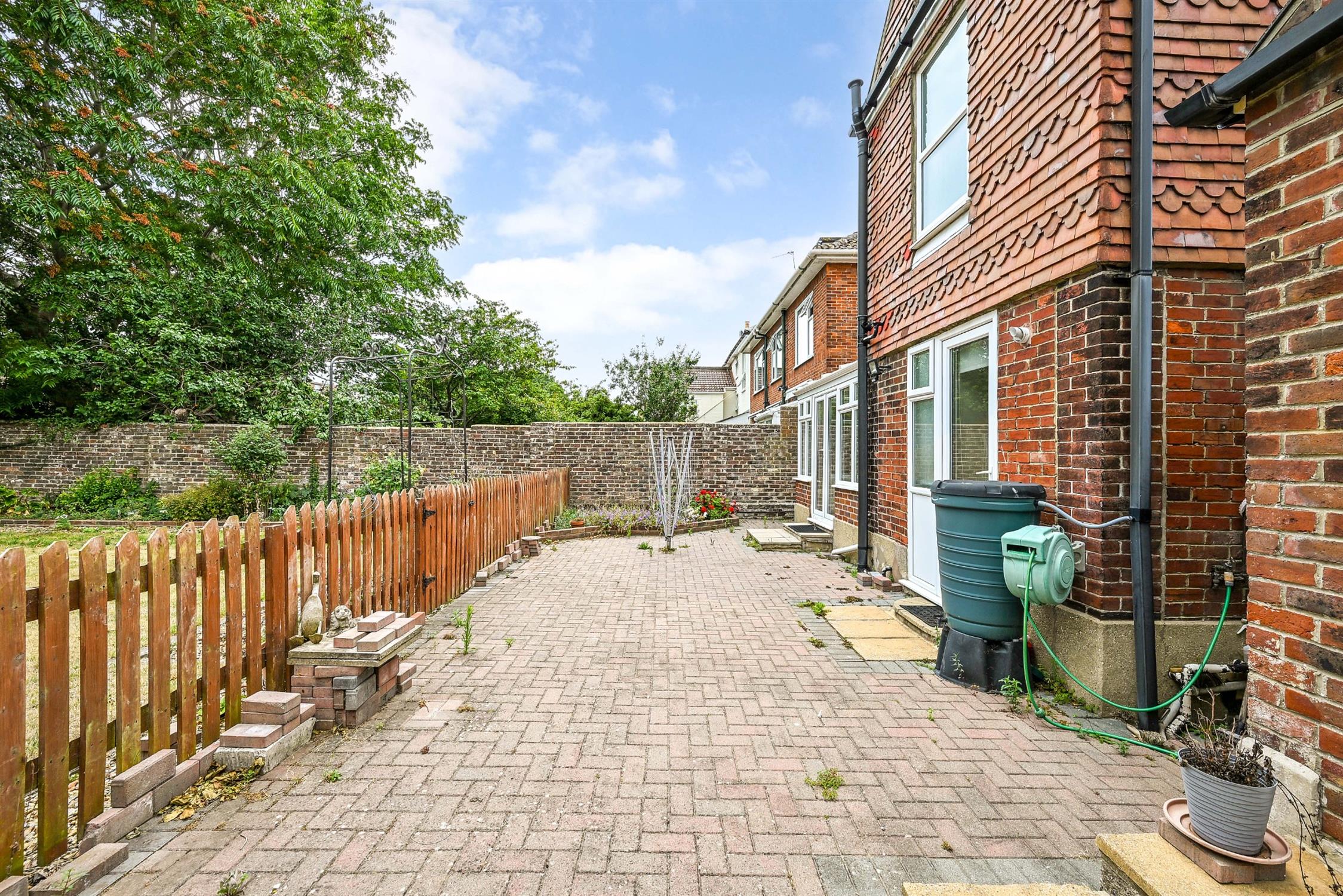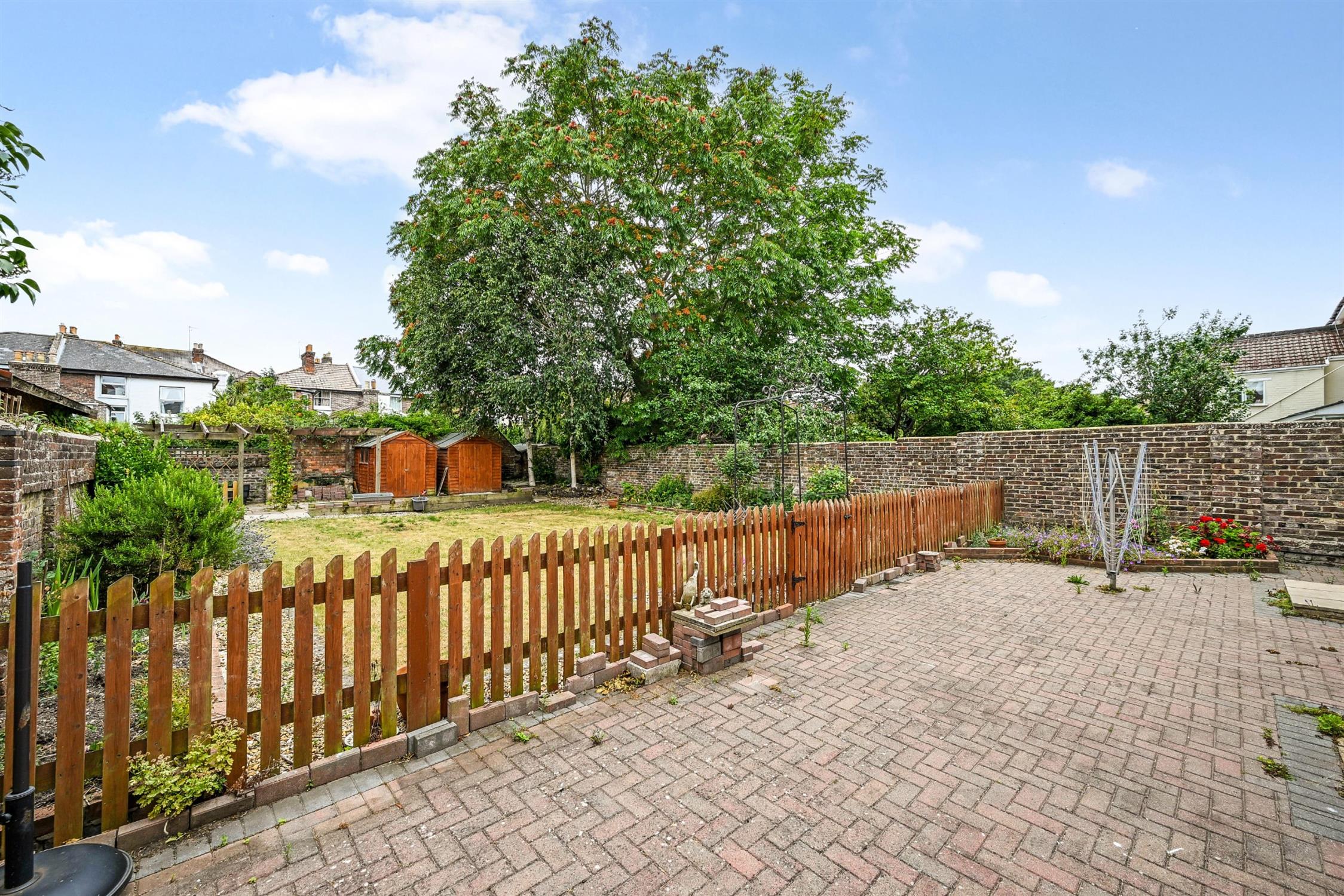 Rear - Expansive South facing walled rear garden, area of patio, lawn, planting beds, two storage sheds, pergola.