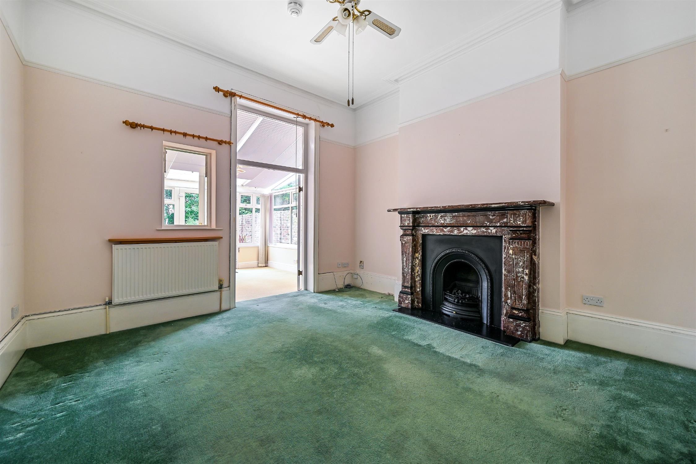Smooth ceiling, ornate cornicing, picture rails, high skirting boards, glazed doors and windows to conservatory, coal effect gas fire with marble surround, two radiators, fitted carpet.
