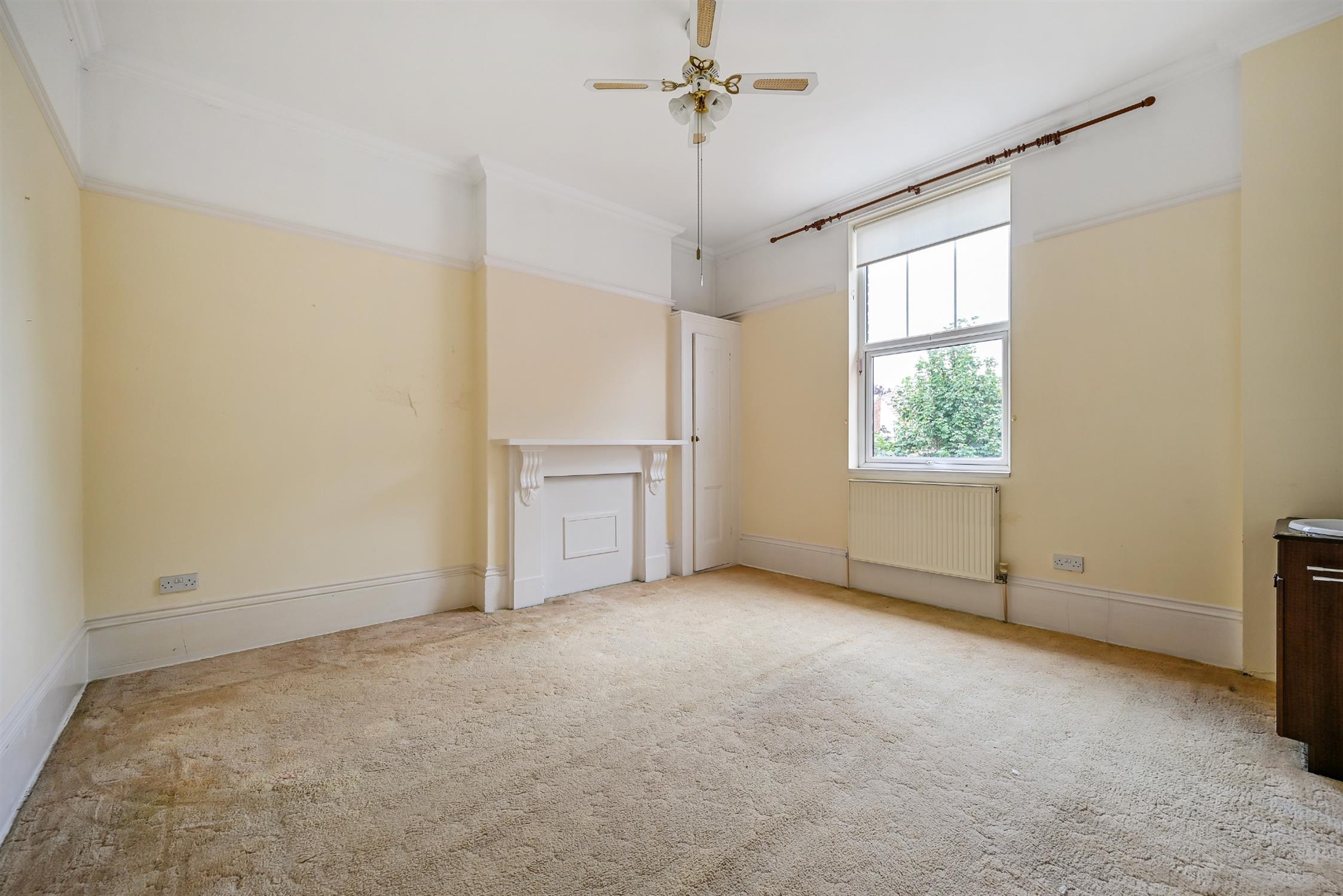 Smooth ceiling, ornate cornicing, picture rails, high skirting boards, double glazed bay window, gas fire with surround, radiator, fitted carpet.