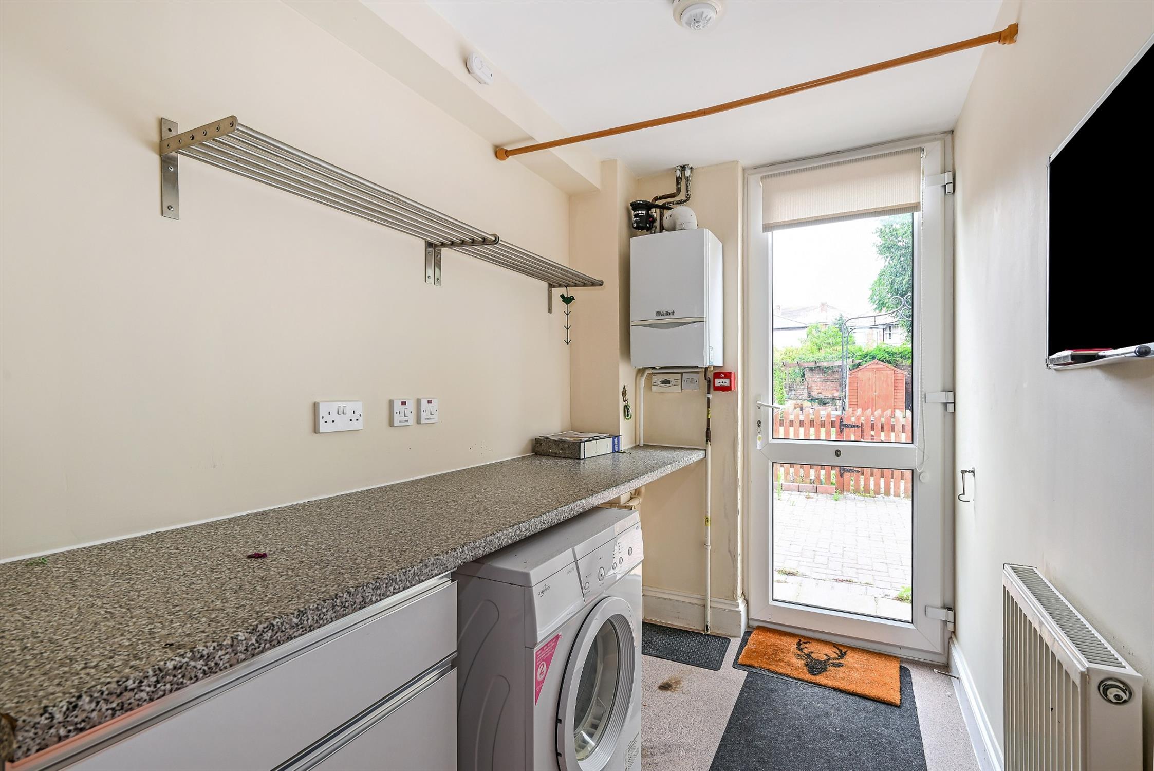 Smooth ceiling, double glazed door to rear garden, fitted base units with work surface over, space and plumbing for washing machine and tumble dryer, radiator, part fitted carpet, part vinyl flooring.