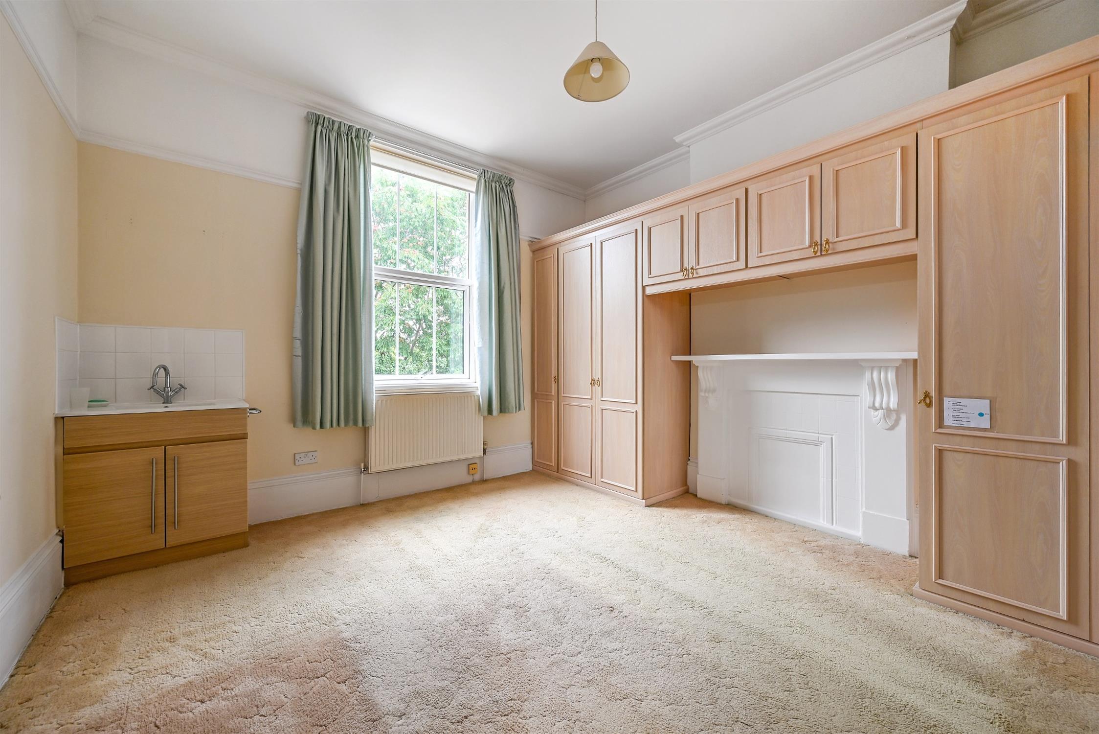 Smooth, coved ceiling, picture rails, high skirting boards, double glazed window, boarded fire place with surround, fitted cupboard, radiator, wash hand basin with cupboards beneath, fitted carpet.