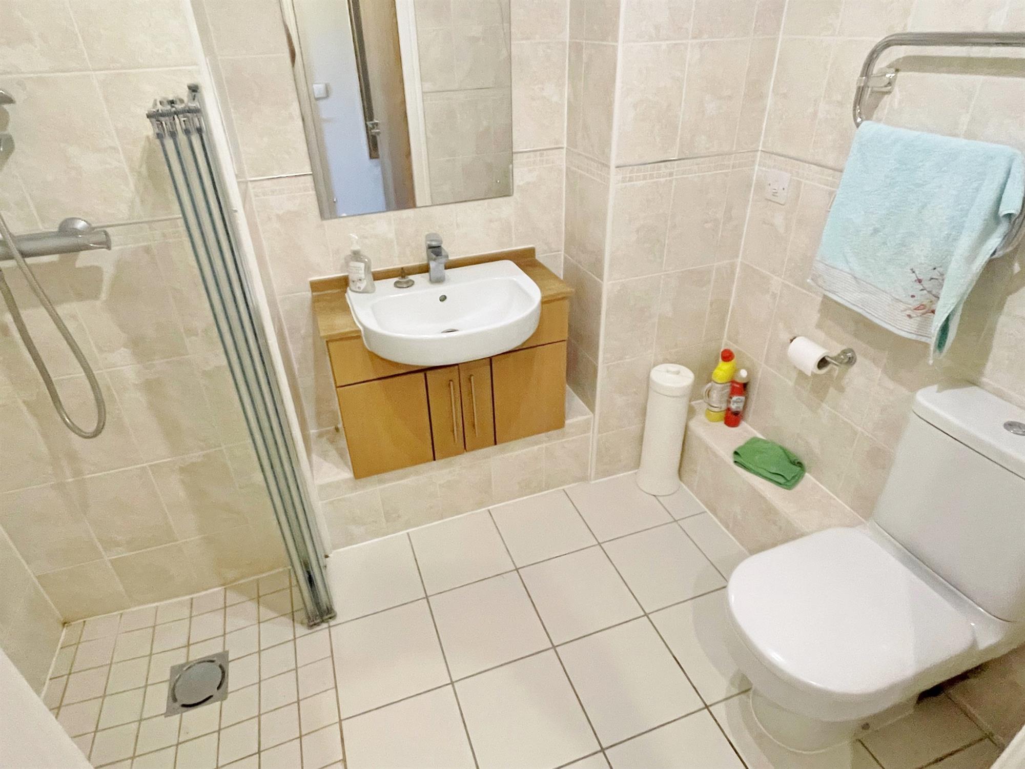 Walk in shower unit with glazed screen. Fully tiled with complementary tiling. Underfloor heating.