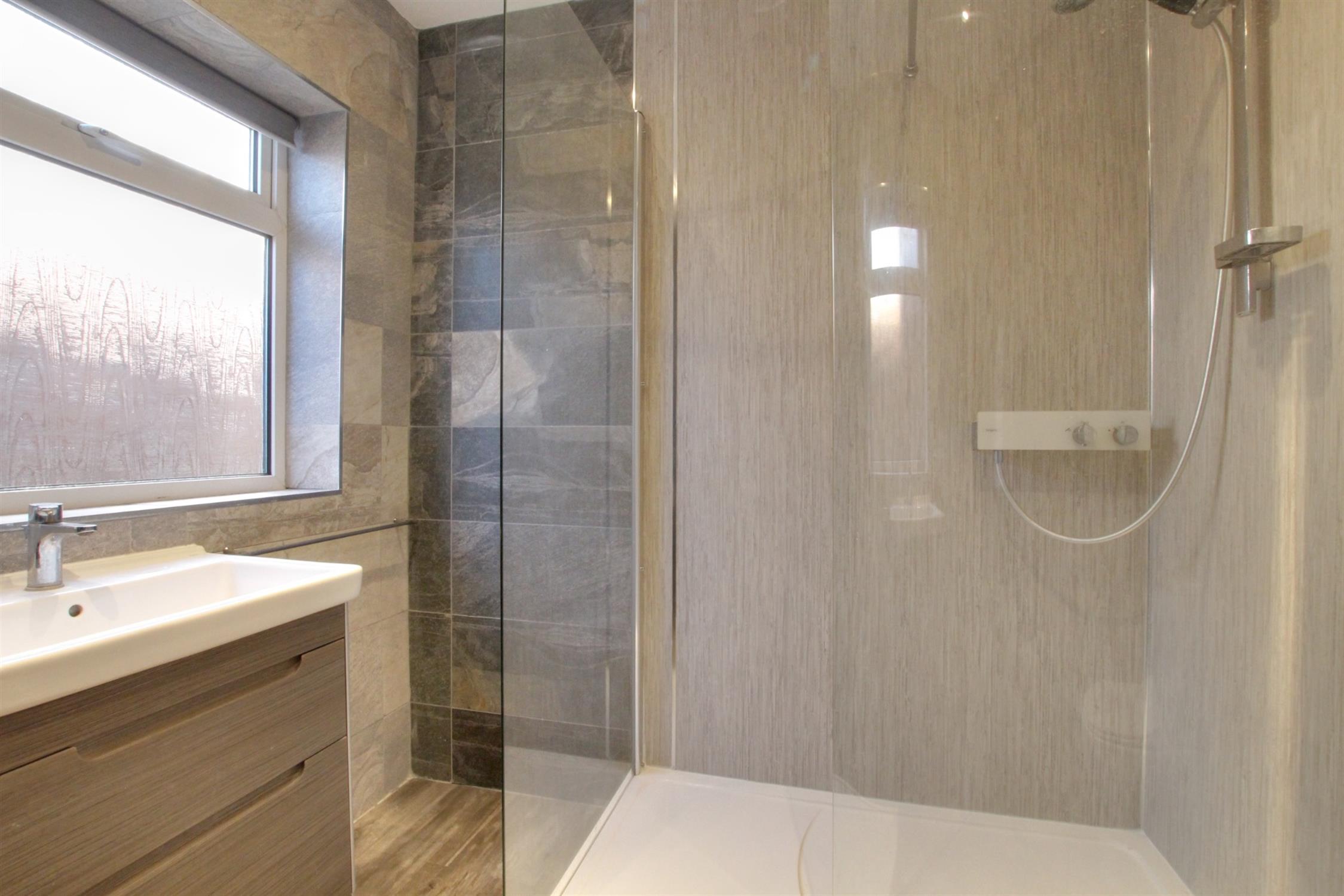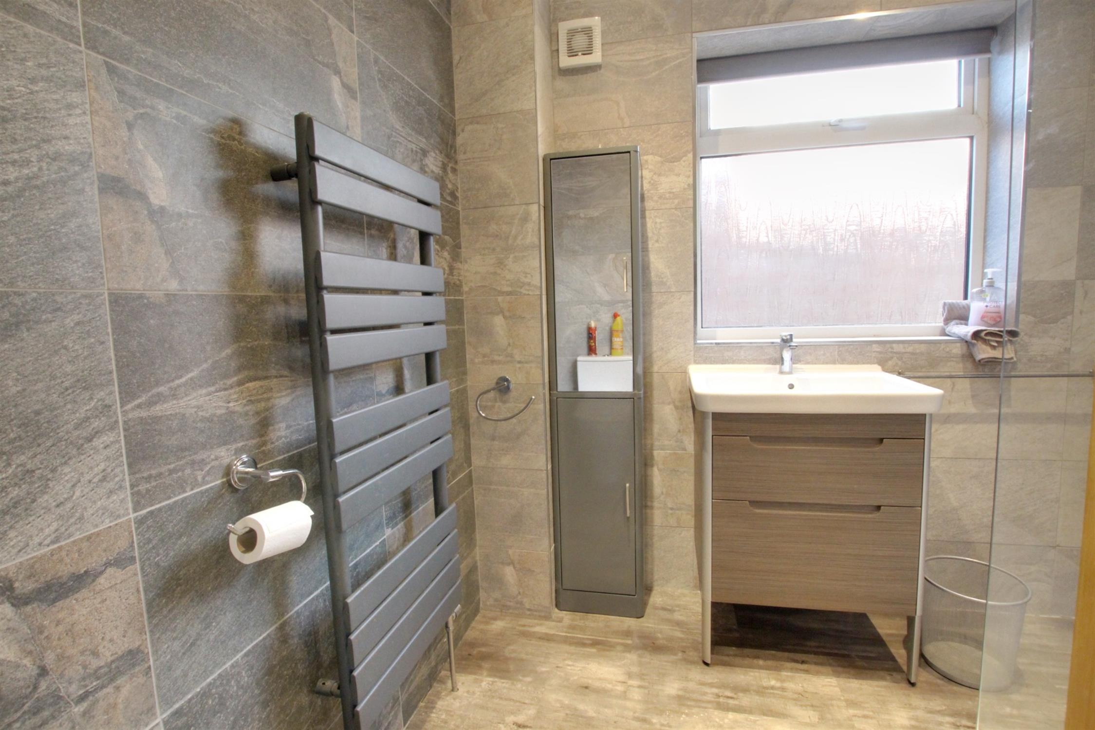 SHOWER ROOM: Obscured double-glazed window to side elevation. Step in shower, wash basin with mixer taps and storage under. Low level W.C. Chrome radiator/towel rail, wood laminate flooring, tiled surrounds.