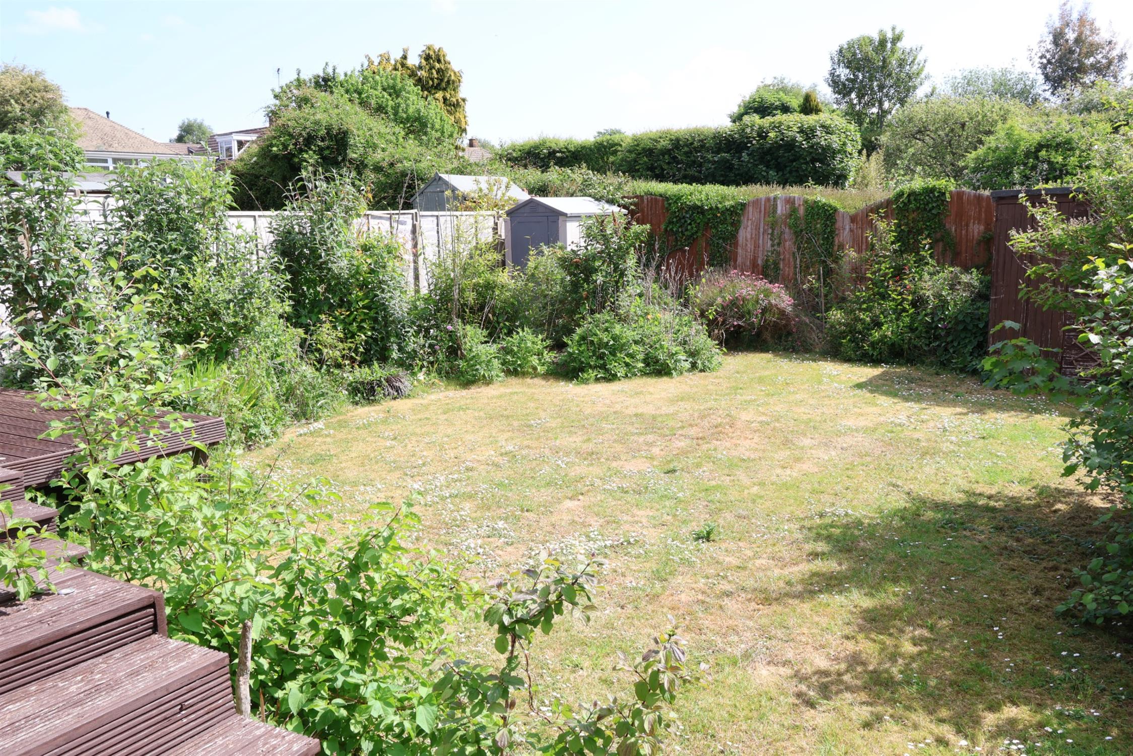 REAR GARDEN: Offering a private, slightly elevated view across the rear gardens of adjoining properties and enclosed with timber fencing and established flower beds and borders. Decked area across the rear gives a nice terrace with access into the lounge and kitchen to the side. Wood store and two sheds to remain with a lower patio area with access to the workshop and garage. Outside water tap.