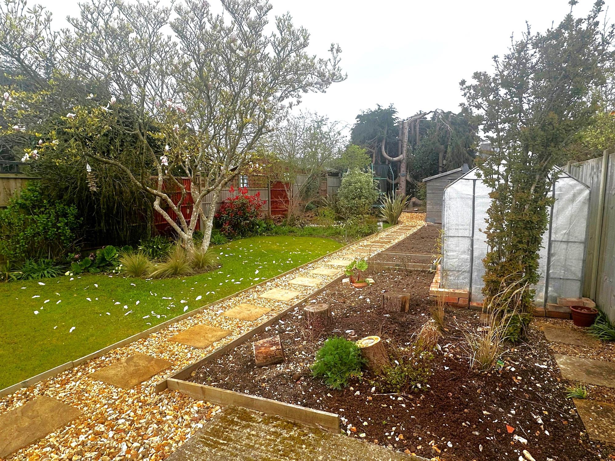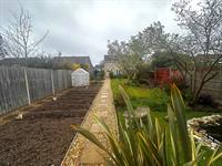 Fenced to boundaries. Large patio area. Laid to lawn. Natural wildlife pond. Raised vegetable beds. Large timber-built garden shed, situated to the rear. Play area with tree bark.