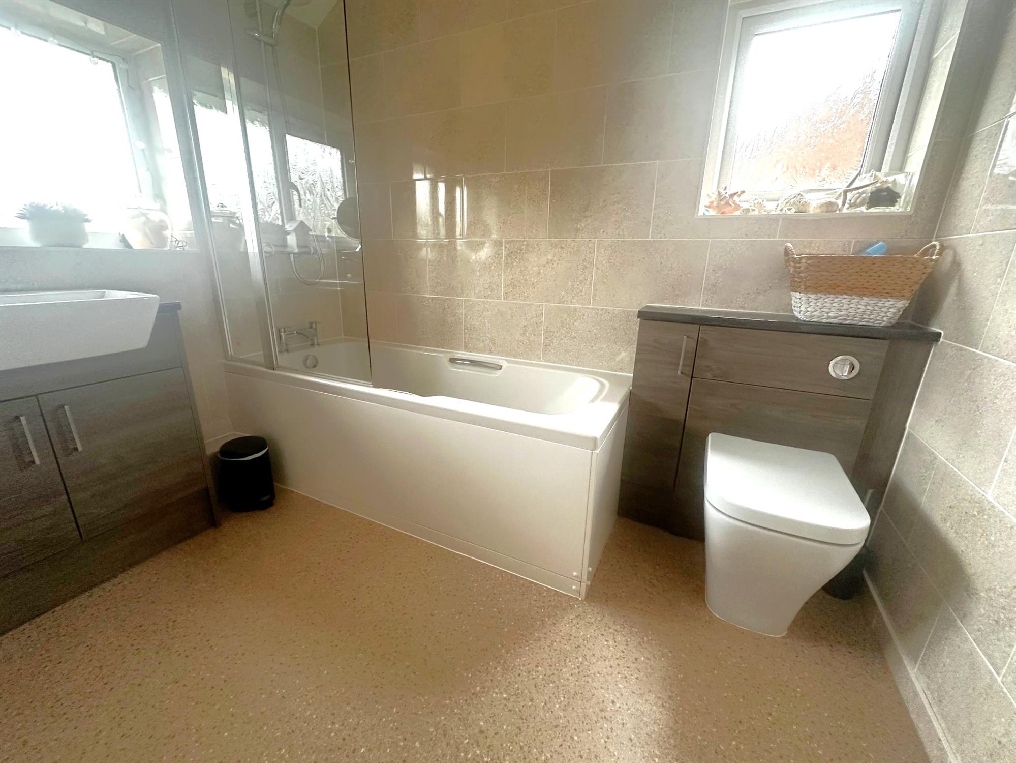 Double glazed window to rear aspect and side. Comprising a white suite of panelled bath with glazed shower screen. Fitted shower over. Vanity unit with inset wash hand basin. Built in cupboards below. Concealed flush WC with storage cupboard to side. Fully tiled with complementary tiling. Heated towel radiator.