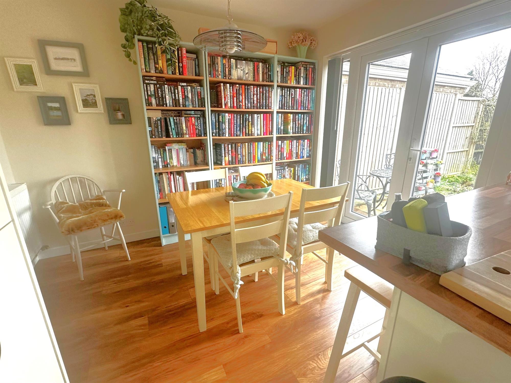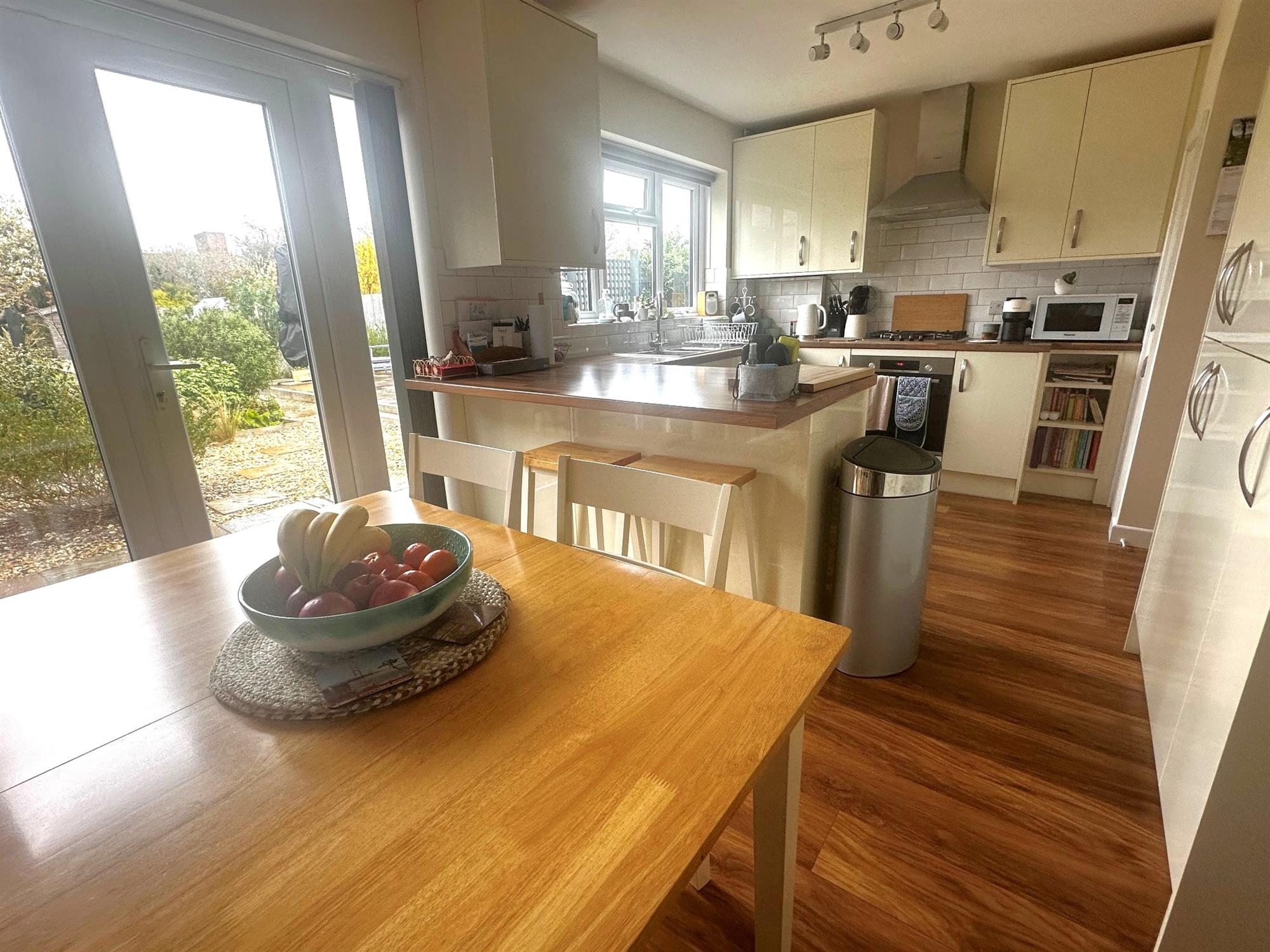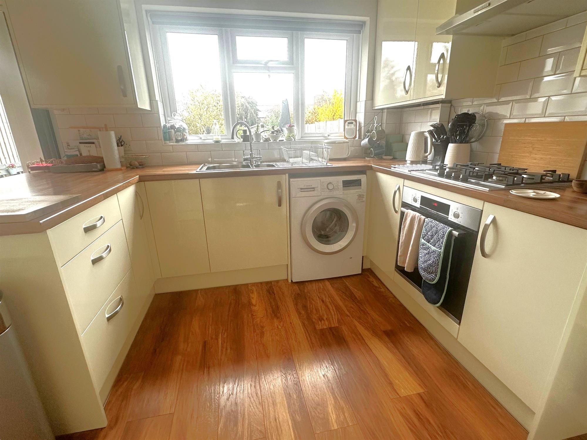 Double glazed window to rear. Double glazed french doors to garden. Refitted with a cream high gloss base and wall units with working surfaces over and complimentary tiling to splashbacks. Integrated fridge freezer. Space and plumbing for washing machine. Inset gas oven. Built in storage cupboard with gas and electric meter. Cupboard housing Ideal combi boiler. Wood effect laminate flooring.