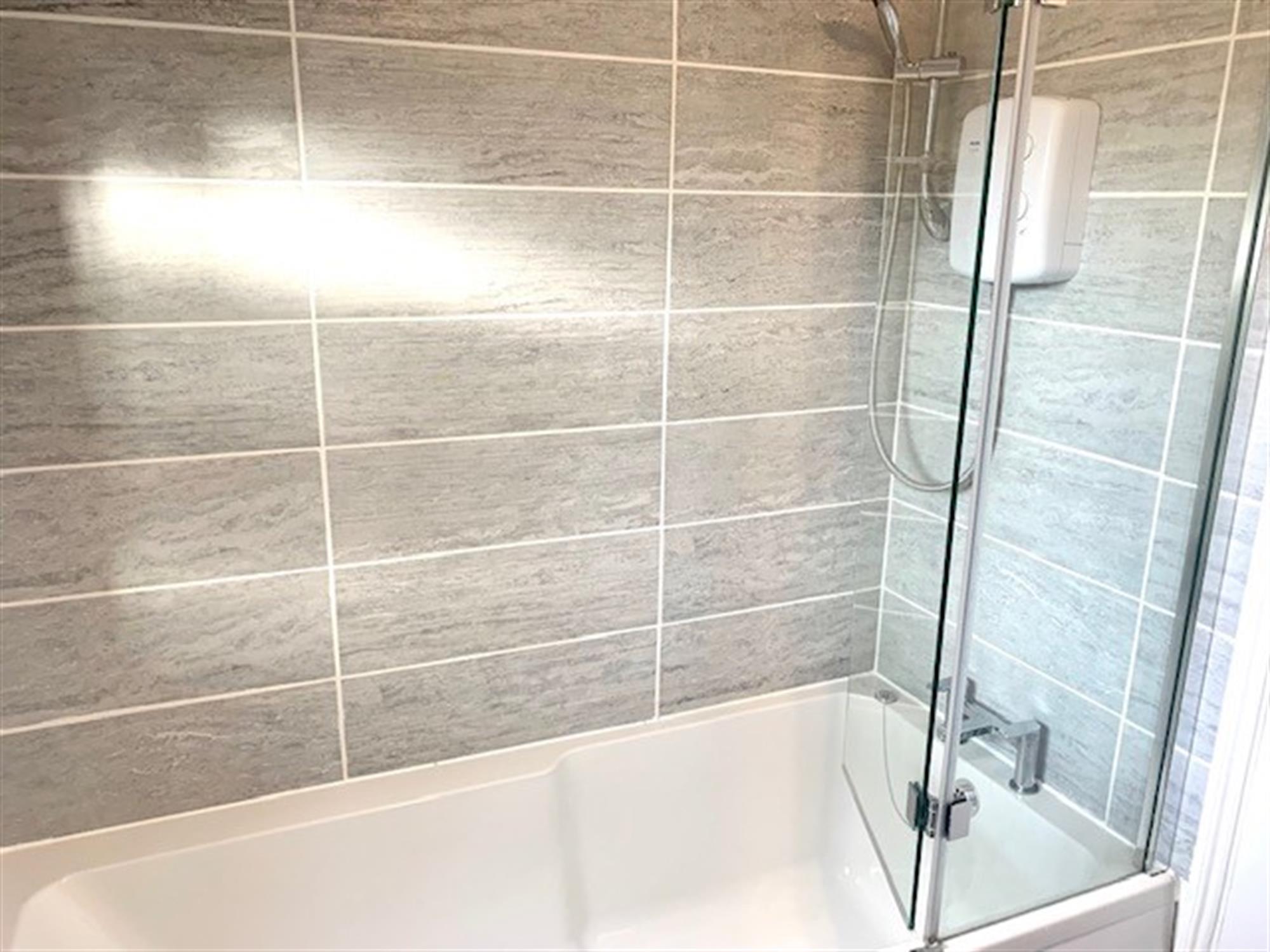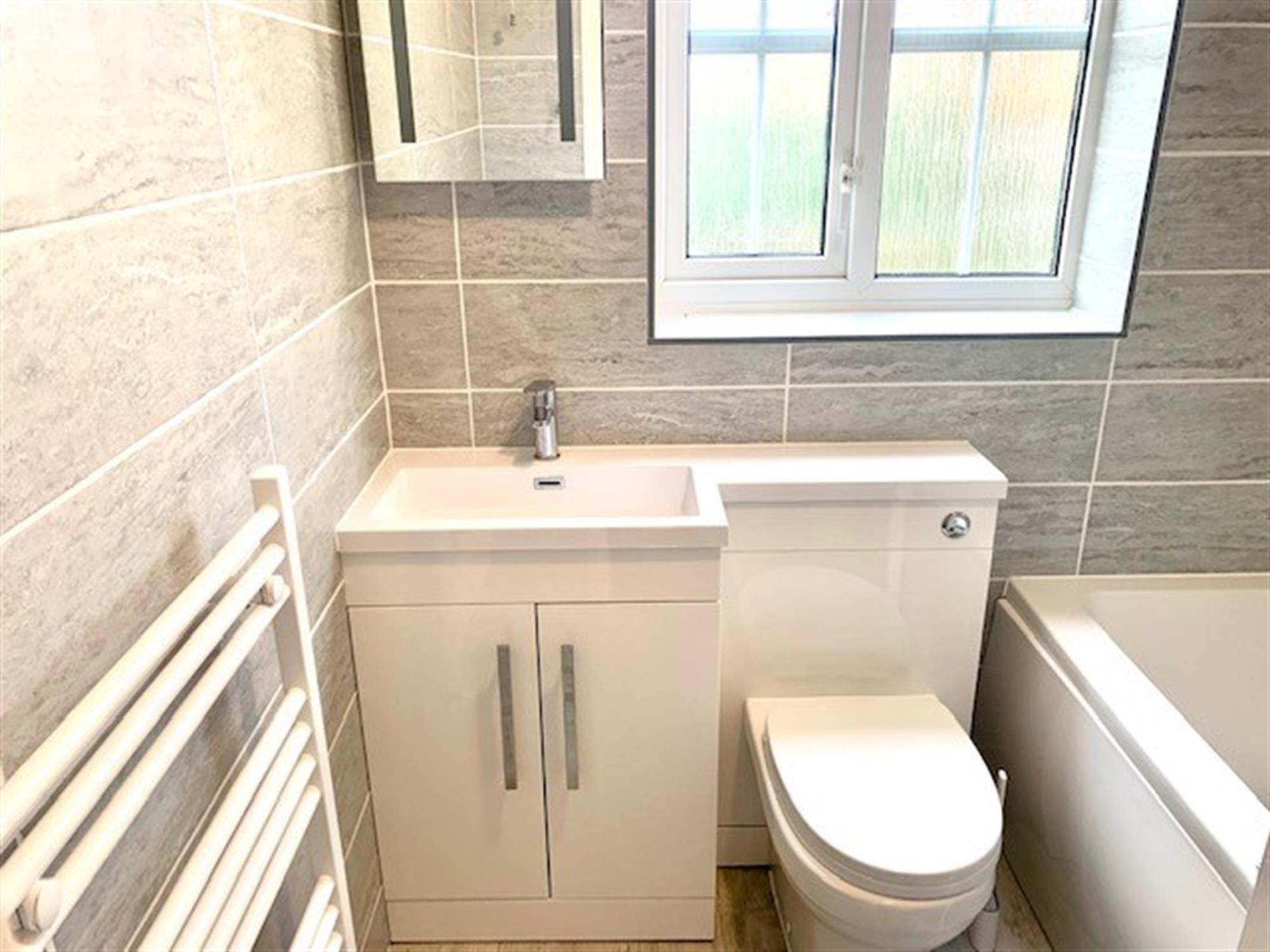 BATHROOM - White suite with bath with shower over, basin with vanity cupboard and toilet.
