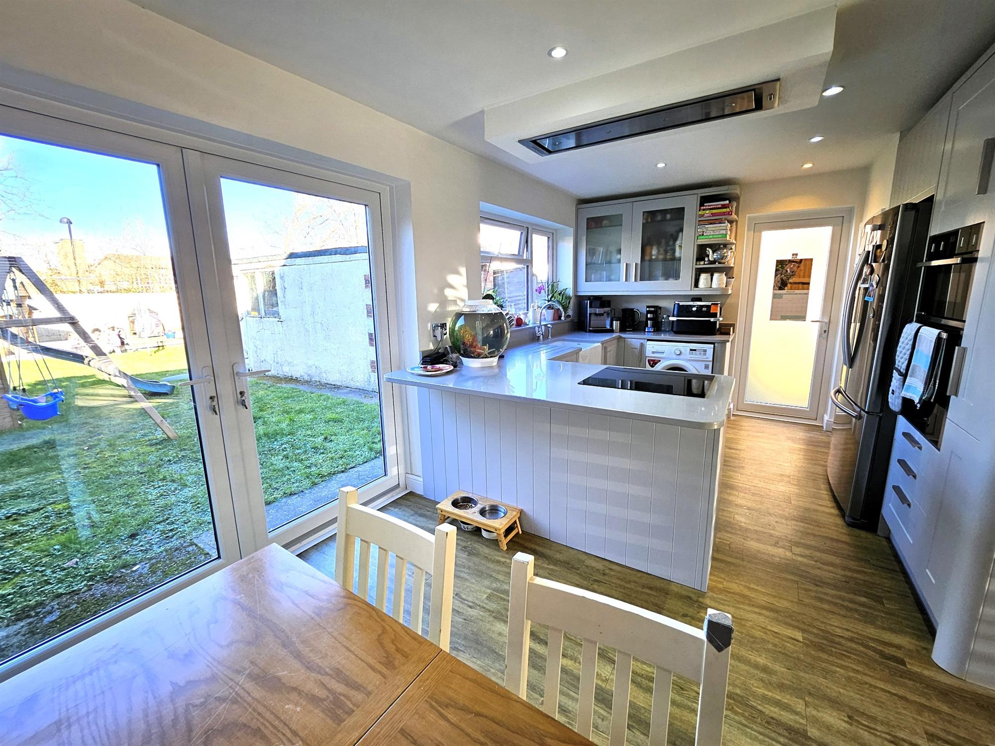 A refitted range of light grey eye and base level units with quartz stone work surfacing, inset ceramic Belfast sink with mixer tap over, two fitted eye level Neff ovens, inset ceramic induction hob with ceiling mounted feature flush stainless steel extractor fan incorporating ceiling down lights, space and plumbing for automatic washing machine, intergrated dishwasher, space and plumbing for an American size-style refrigerator, double-glazed door to the sideway, double-glazed window to the rear aspect, quartz stone breakfast bar - table, timber effect laminated flooring, open aspect to the dining area, space for table and chairs, two vertical feature column radiators, timber effect flooring, feature wall art - mural, double-glazed french doors opening to and accessing the rear gardens.