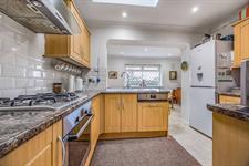 Smooth plastered ceiling, coving, a complimentary range of wall mounted and base level units with roll edge worktop over. Ceramic sink, integrated appliances, gas hob with extractor hood over, linoleum flooring.