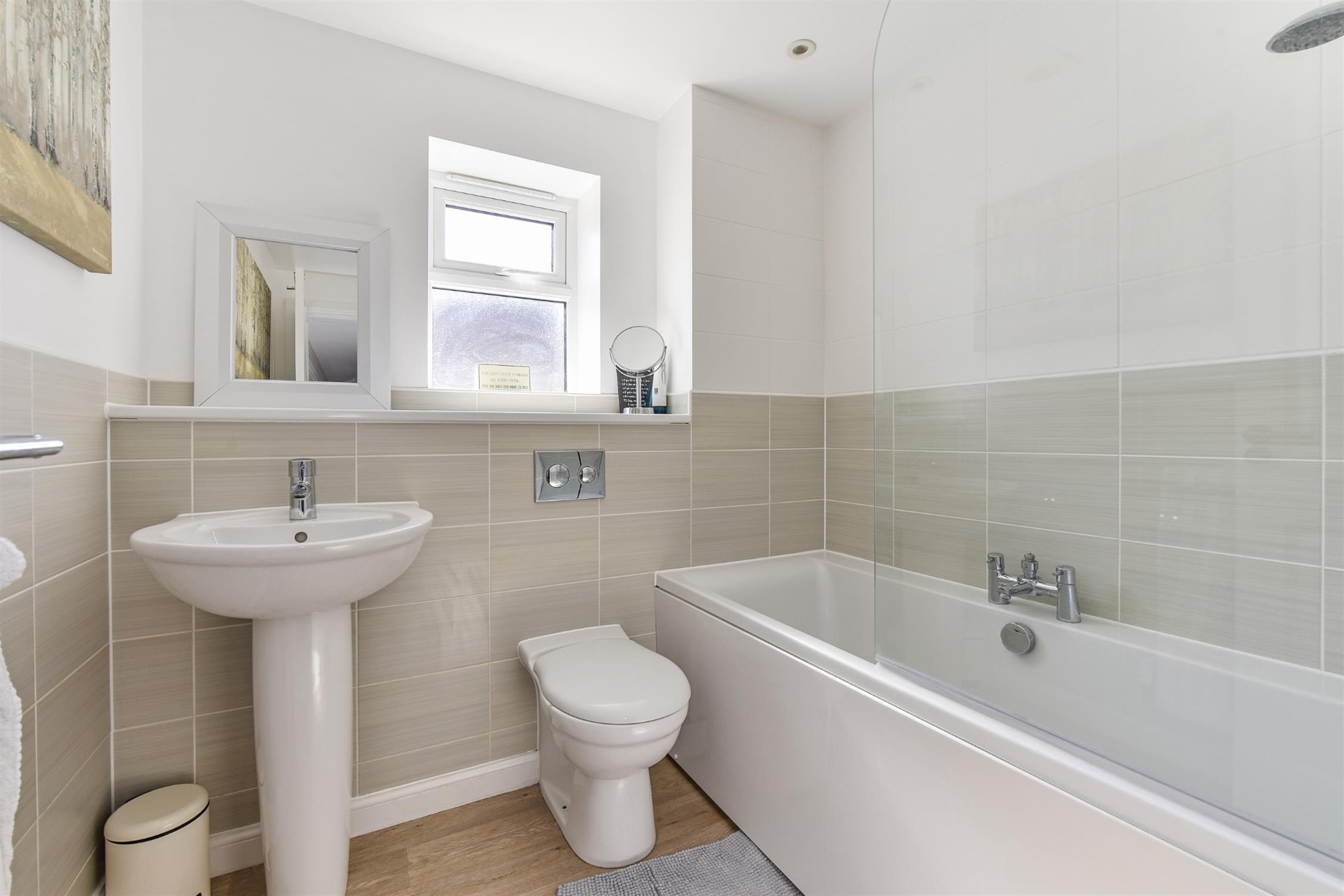 Half tiled. Panel bath with independent shower over. Close couple W.C. Pedestal wash basin. Obscure double glazed window. Radiator.