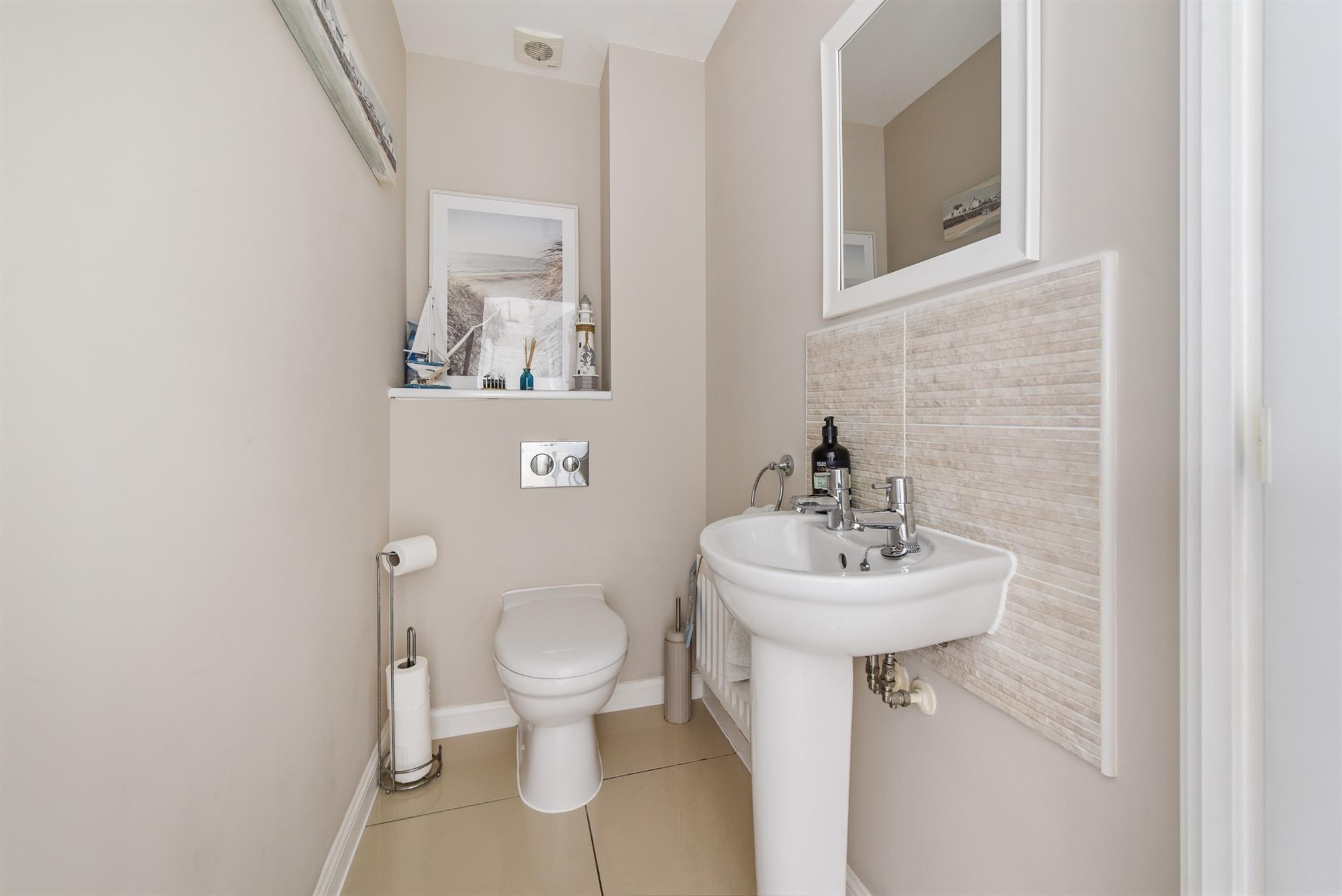 Close couple W.C. Pedestal wash basin with tile splash back. Radiator. Extractor fan..