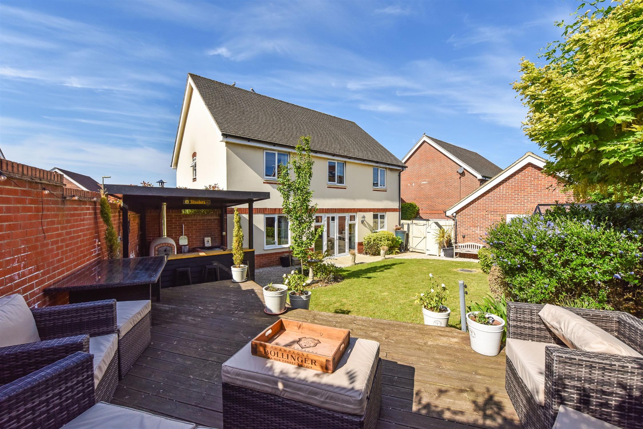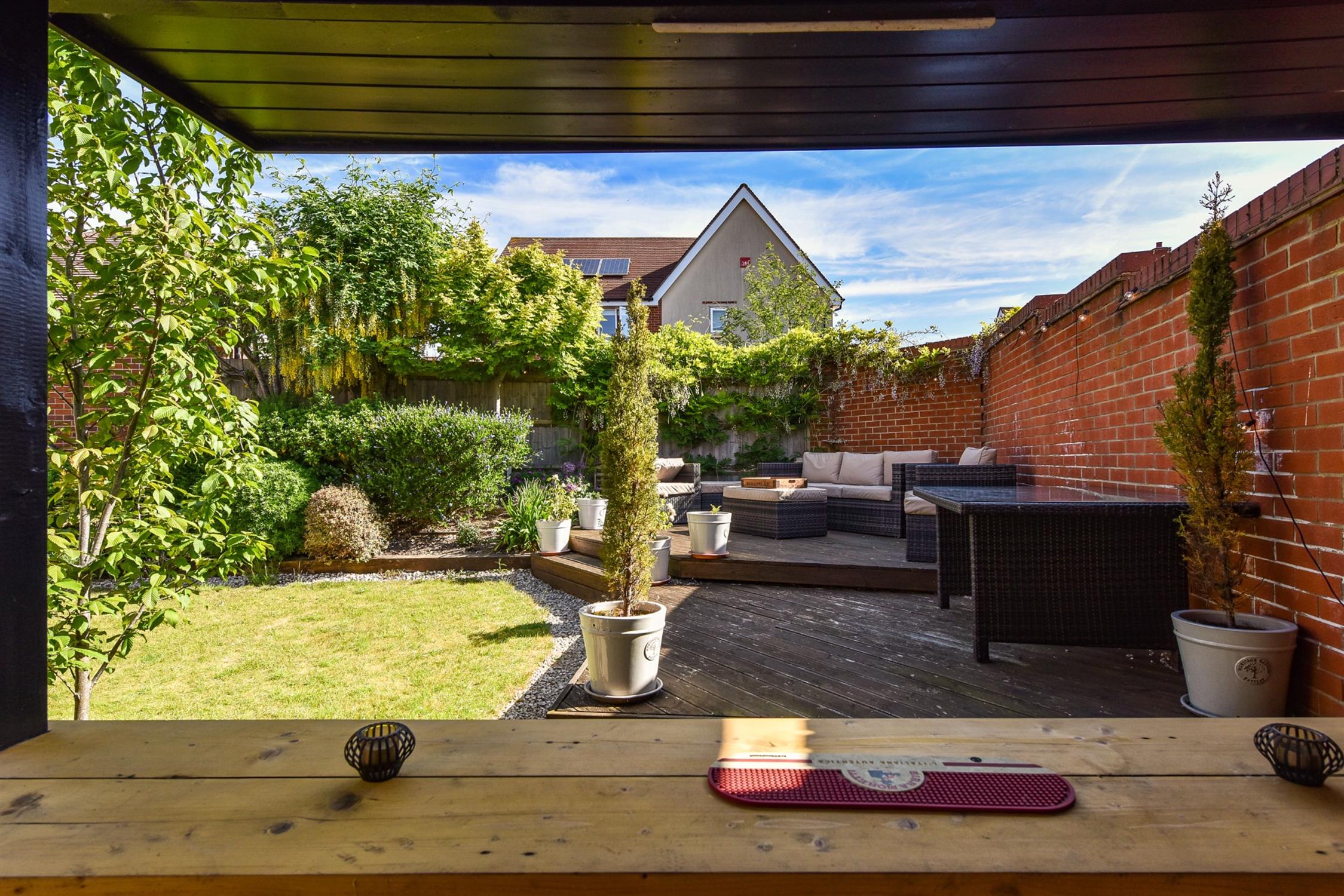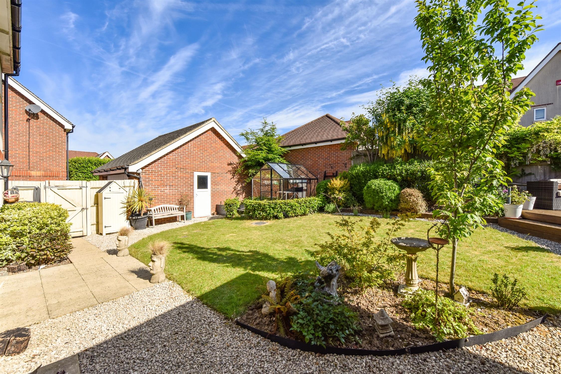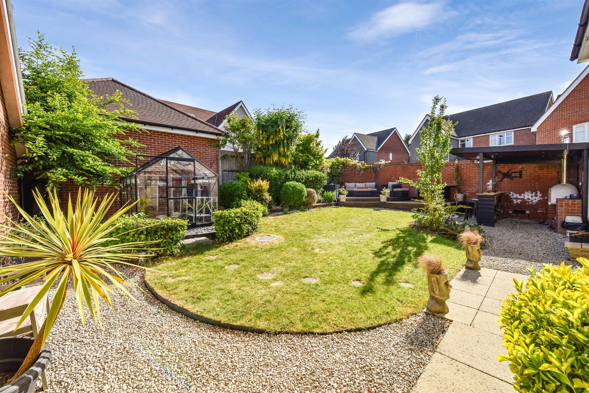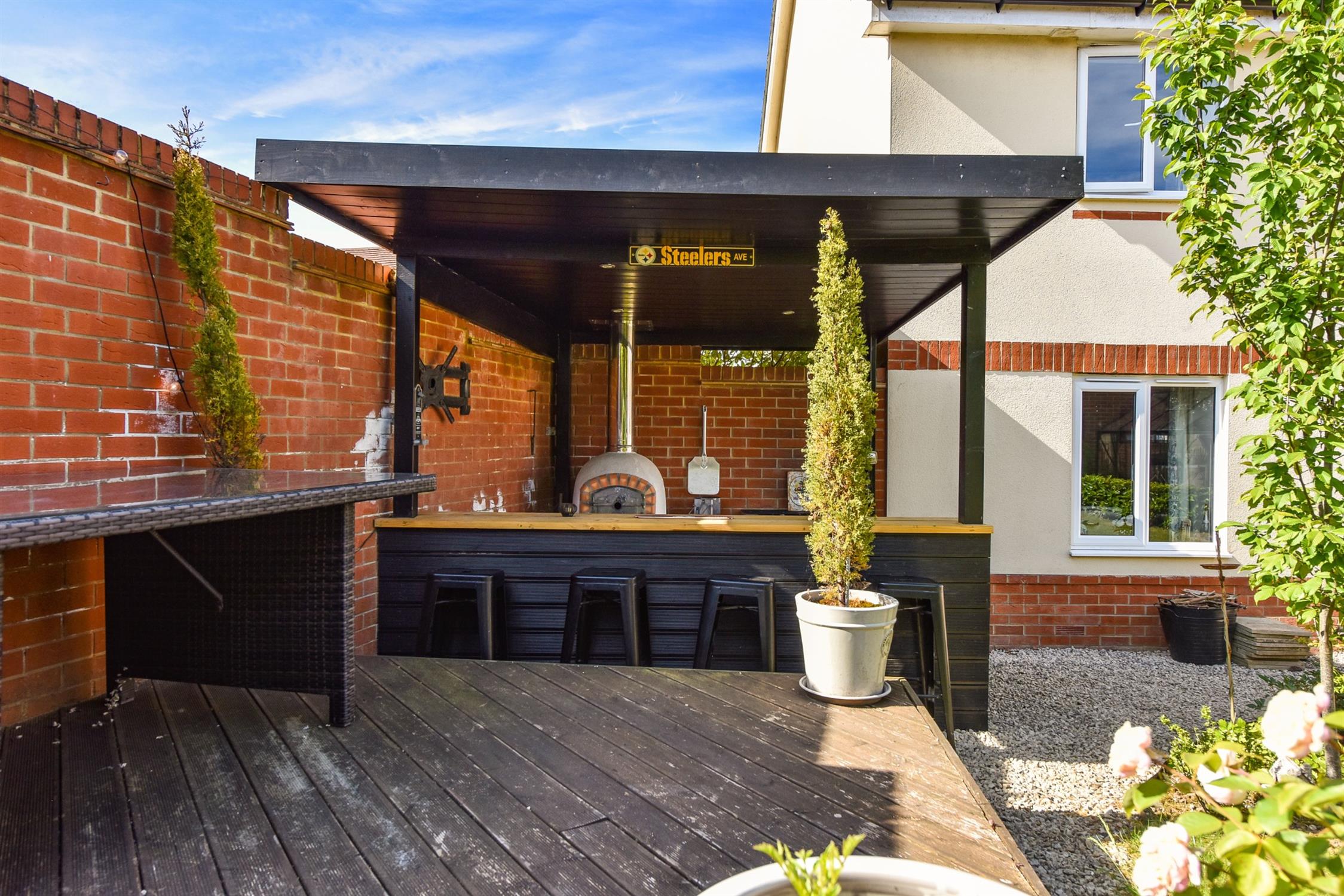 The professionally landscaped rear garden is a particular feature of the property. Set around a central lawn with well planted colourful mature shrub borders. There is a raised decked seating and entertaining area. Covered outdoor kitchen/bar area with power and light featuring brick built bbq and pizza oven. Herb garden and greenhouse.