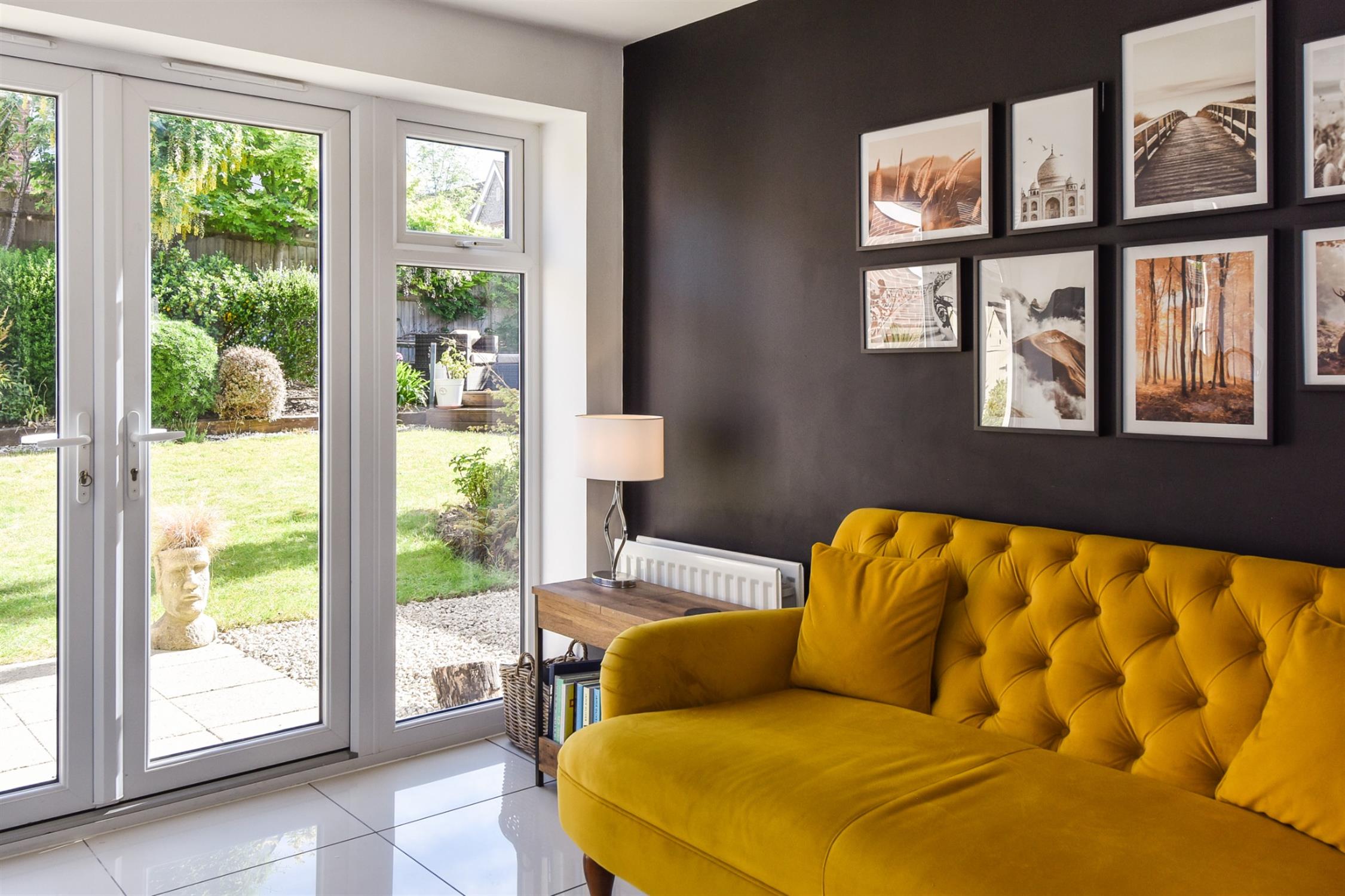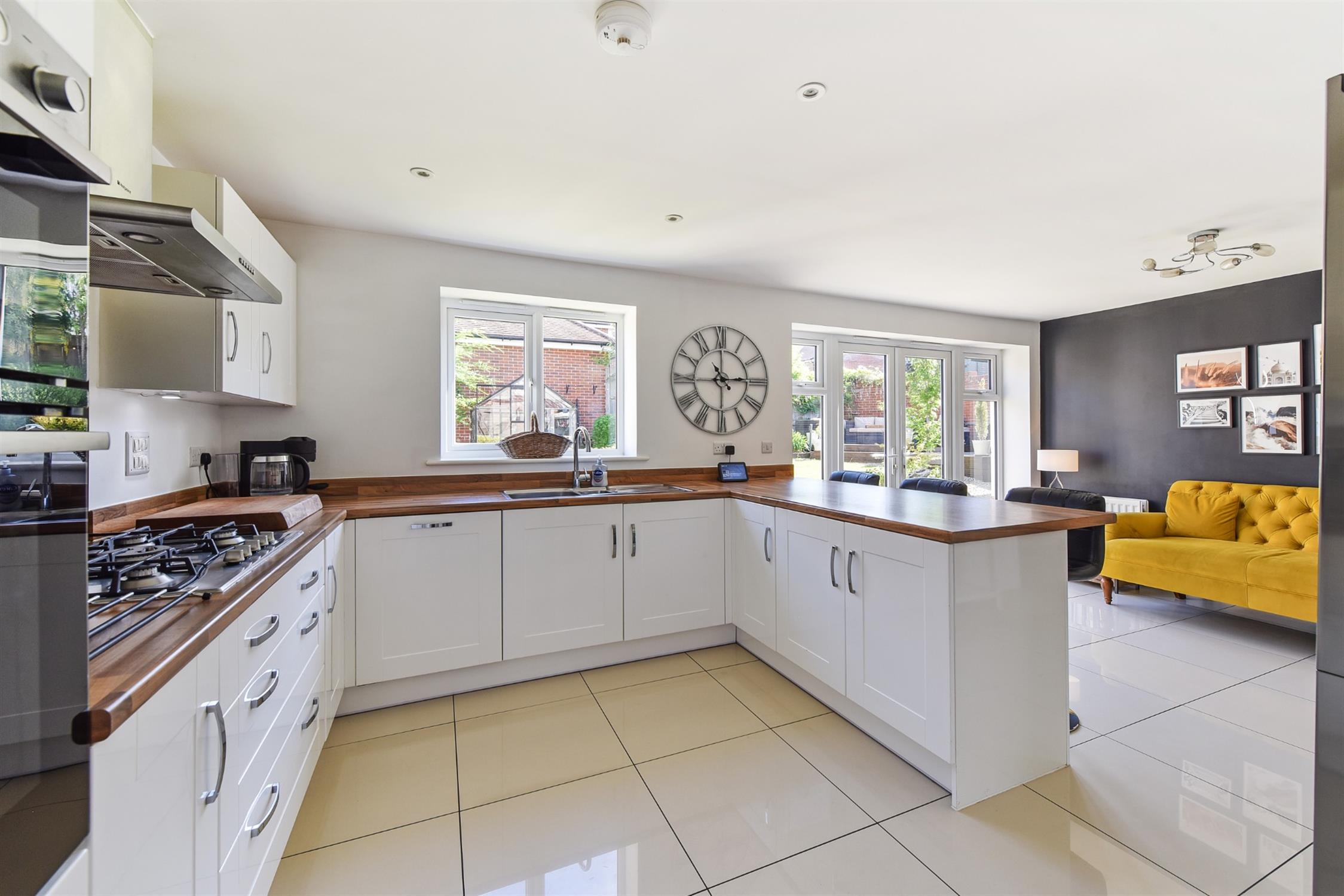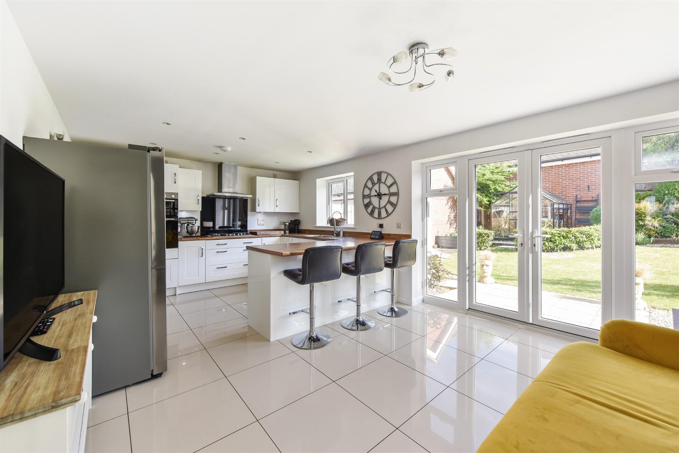 Large open plan room with polished porcelain tile floor overlooking landscaped rear garden. French style double doors open from the family area to the rear garden. The kitchen area features a range of high gloss white floor and wall units with contrasting work surfaces. Integrated appliances to include Bosch hob with extractor hood over. Eye level oven and grill. Dishwasher and fridge/freezer. Upright designer radiator.