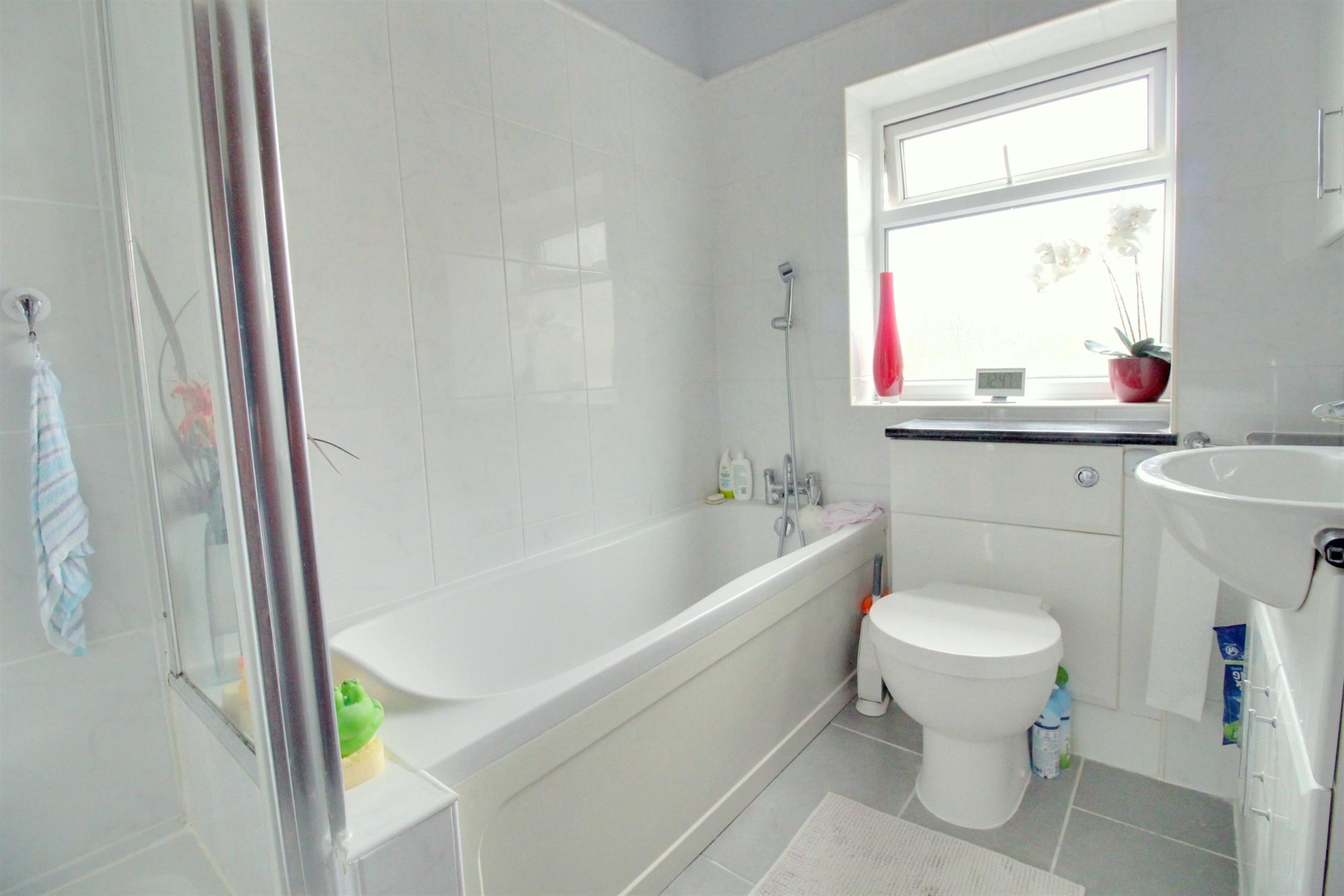 Panel enclosed bath, separate shower cubicle with power shower, panel enclosed bath with shower attachment, concealed flush wc, vanity unit, heated towel rail, tiled walls and floor, side aspect double glazed window.