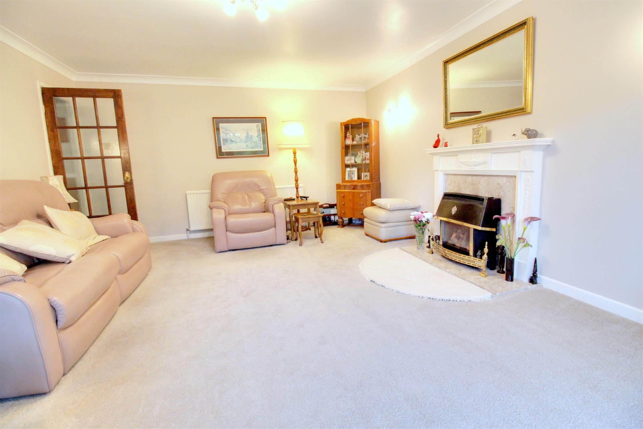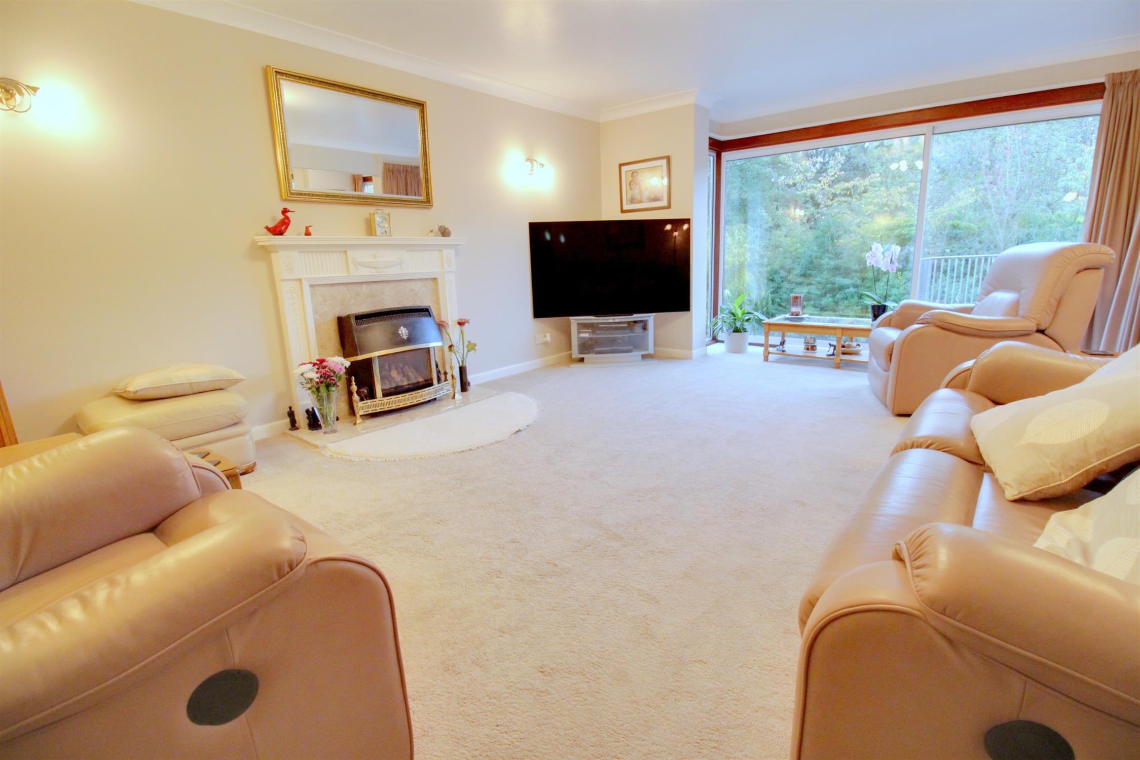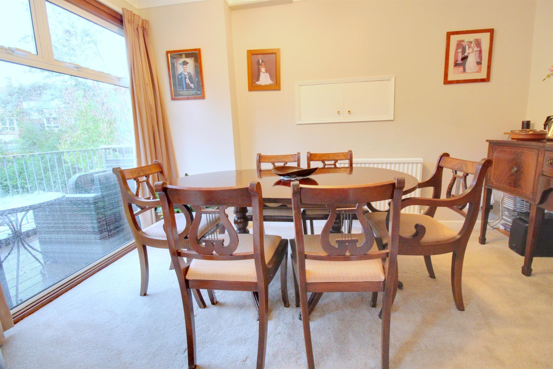 Gas fire with surround, radiator, rear aspect double glazed patio doors leading to the balcony with lovely views of the rear garden, open aspect to the dining room.