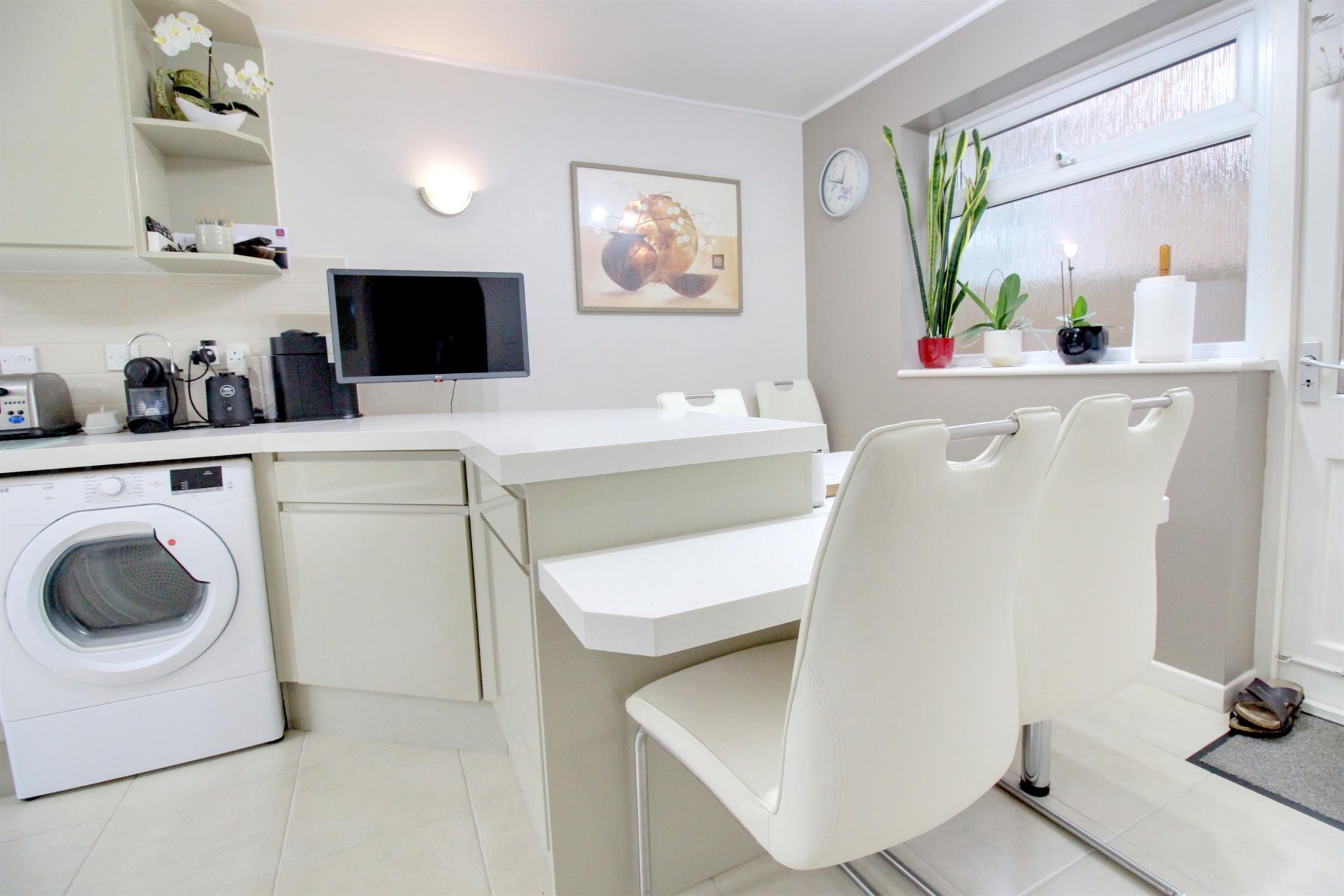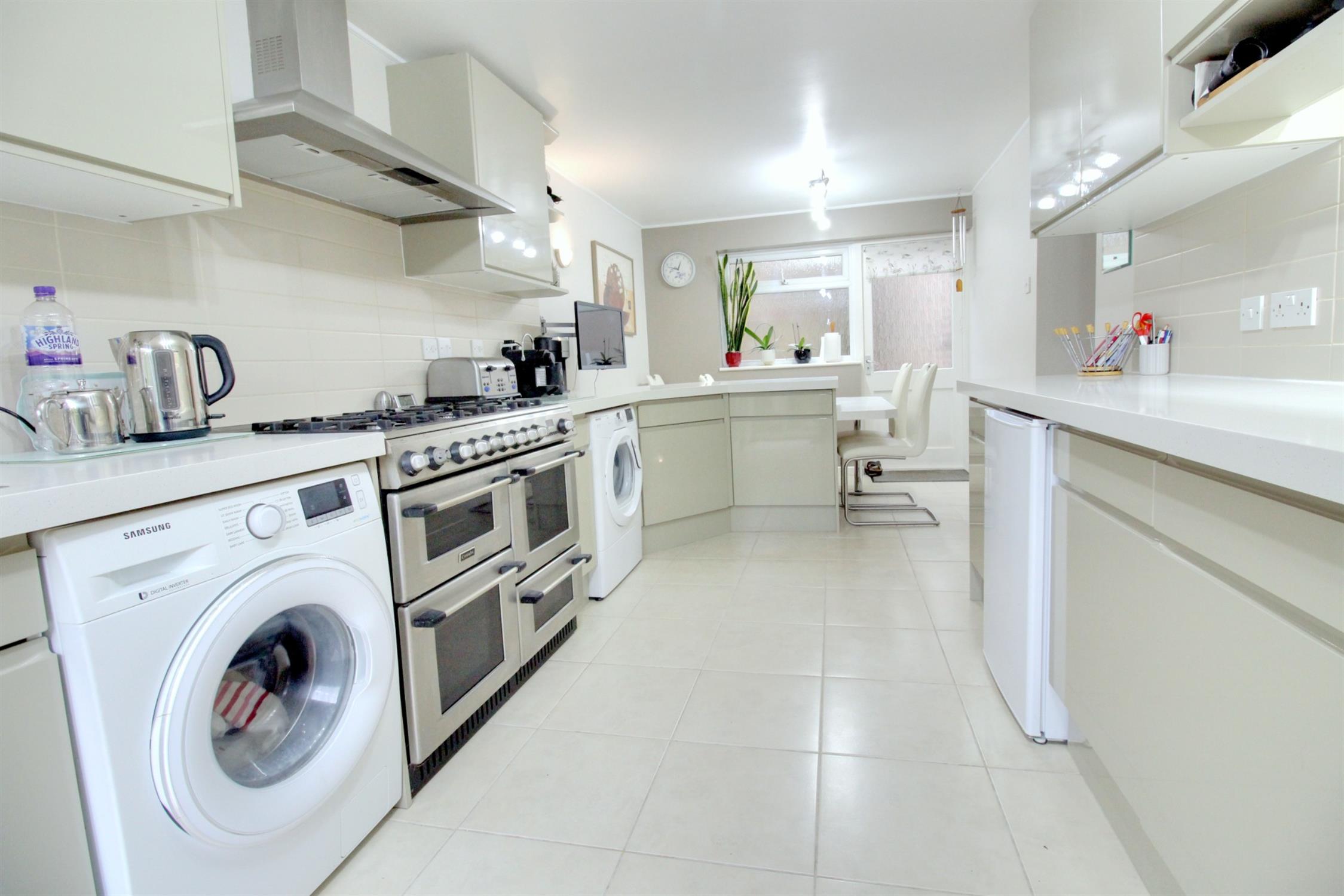 Fitted with a comprehensive range of modern matching wall and base units with quartz work surfaces over, a square quartz breakfast bar, six ring gas range cooker to remain with an extractor hood over, space for washing machine, dishwasher, and tumble dryer, one and a half bowl sink and drainer, floor mounted boiler, tiled flooring, front aspect double glazed window and part glazed door, rear aspect double glazed patio doors leading to the rear garden.