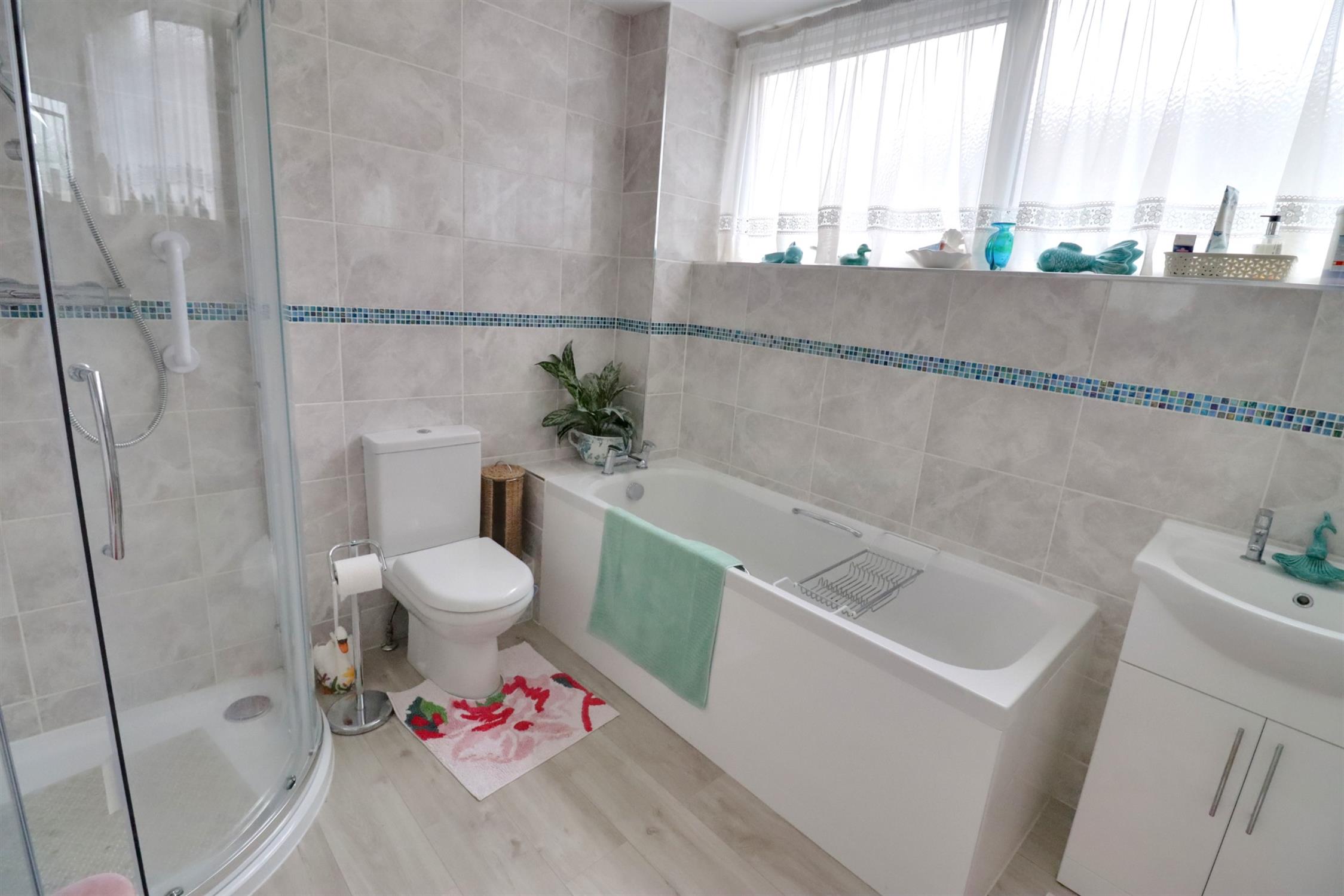 Opaque double glazed window to side, modern four-piece suite comprising: tiled shower cubicle with rainfall shower head and hand held shower attachment, panel enclosed bath. W.C., wash hand basin with storage under, tiled walls, ladder style towel radiator.