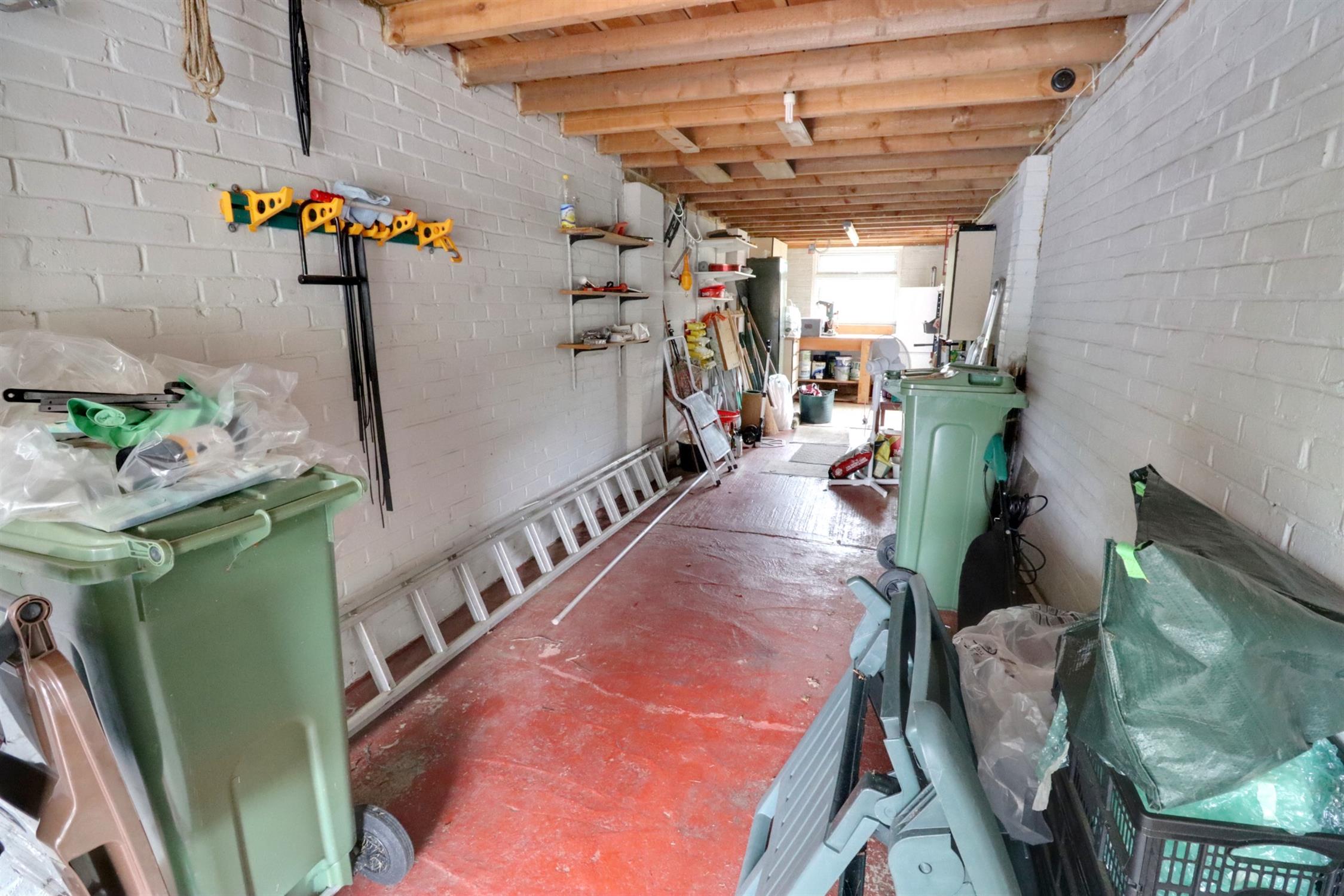Up and over door, power and light, work bench, double glazed window to rear and opaque double door to side.