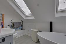 Freestanding bath. WC. Ceramic sink with cupboard under. Heated towel rail. Eaves storage. Two Velux windows.