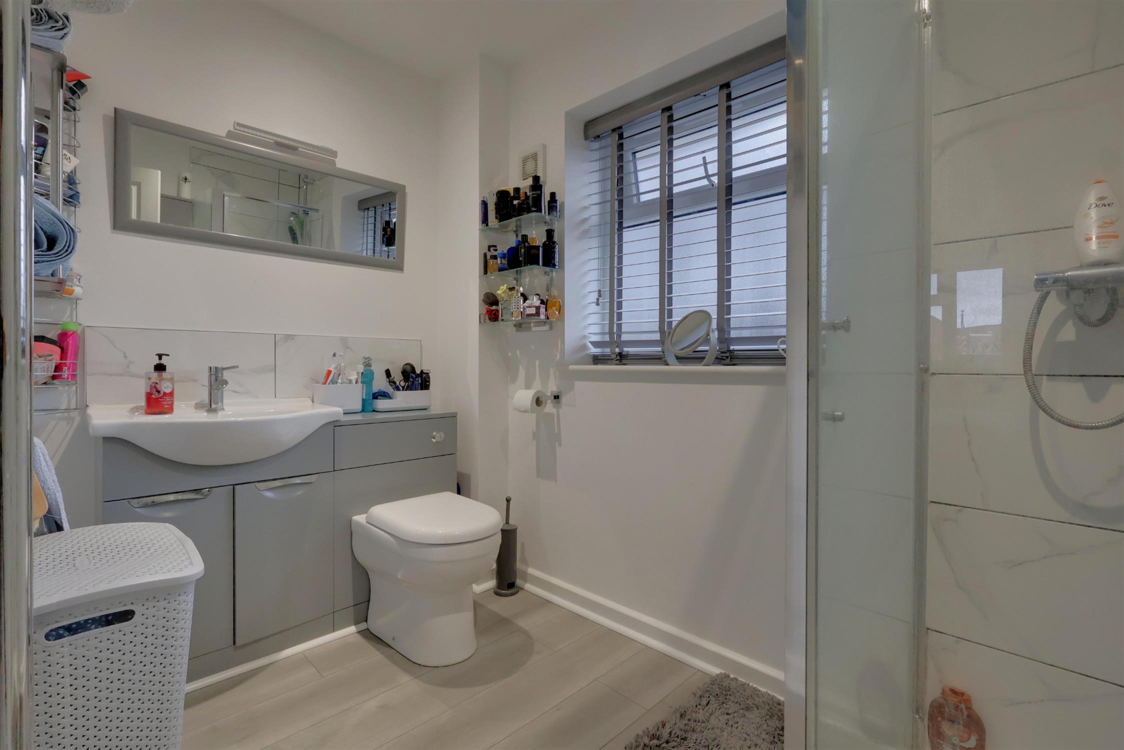Shower cubicle. WC. Ceramic sink with cupboard under. Heated towel rail. Extractor fan. Frosted double glazed window.